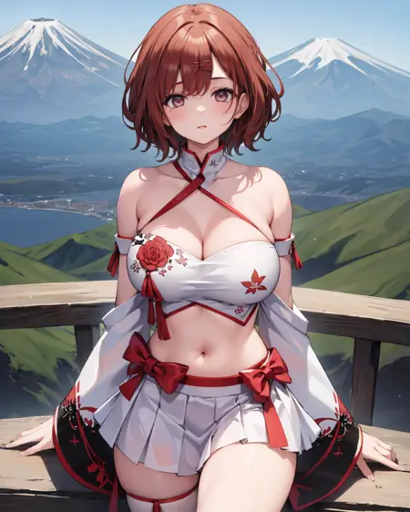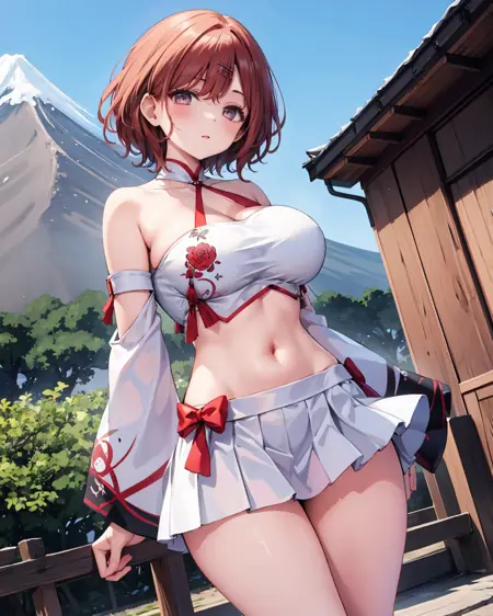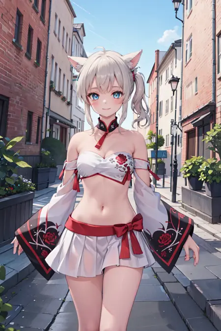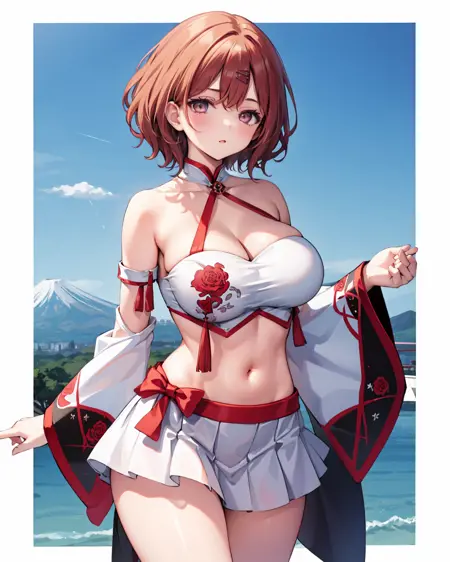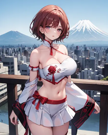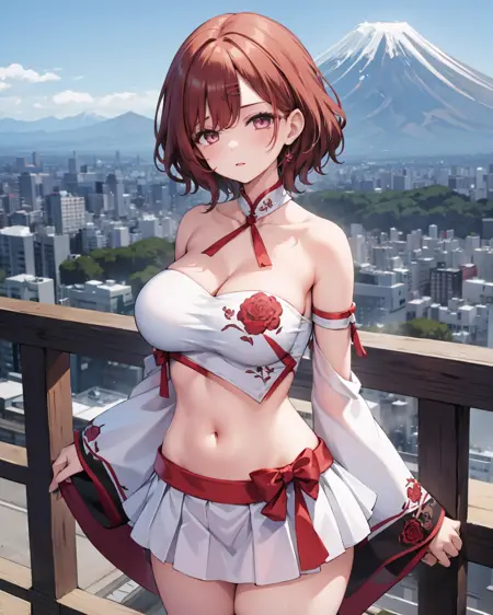 触发词:white bandeau, floral print, detached sleeves, white skirt, miniskirt, red bow, crop top/navel