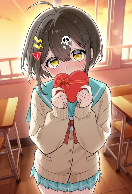 1girl, flag-chan, 黄色い目, 茶色の髪, ショートヘア, 前髪, 目の間の髪, あほ毛, ヘアクリップ, スカルヘアオーナメント, 稲妻の模様