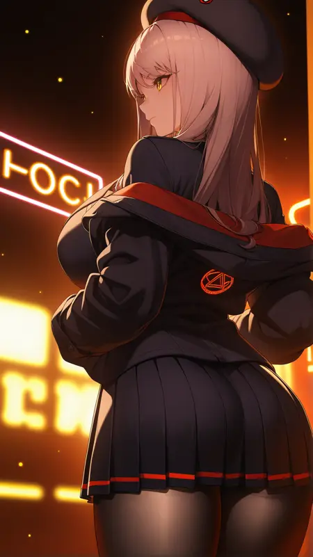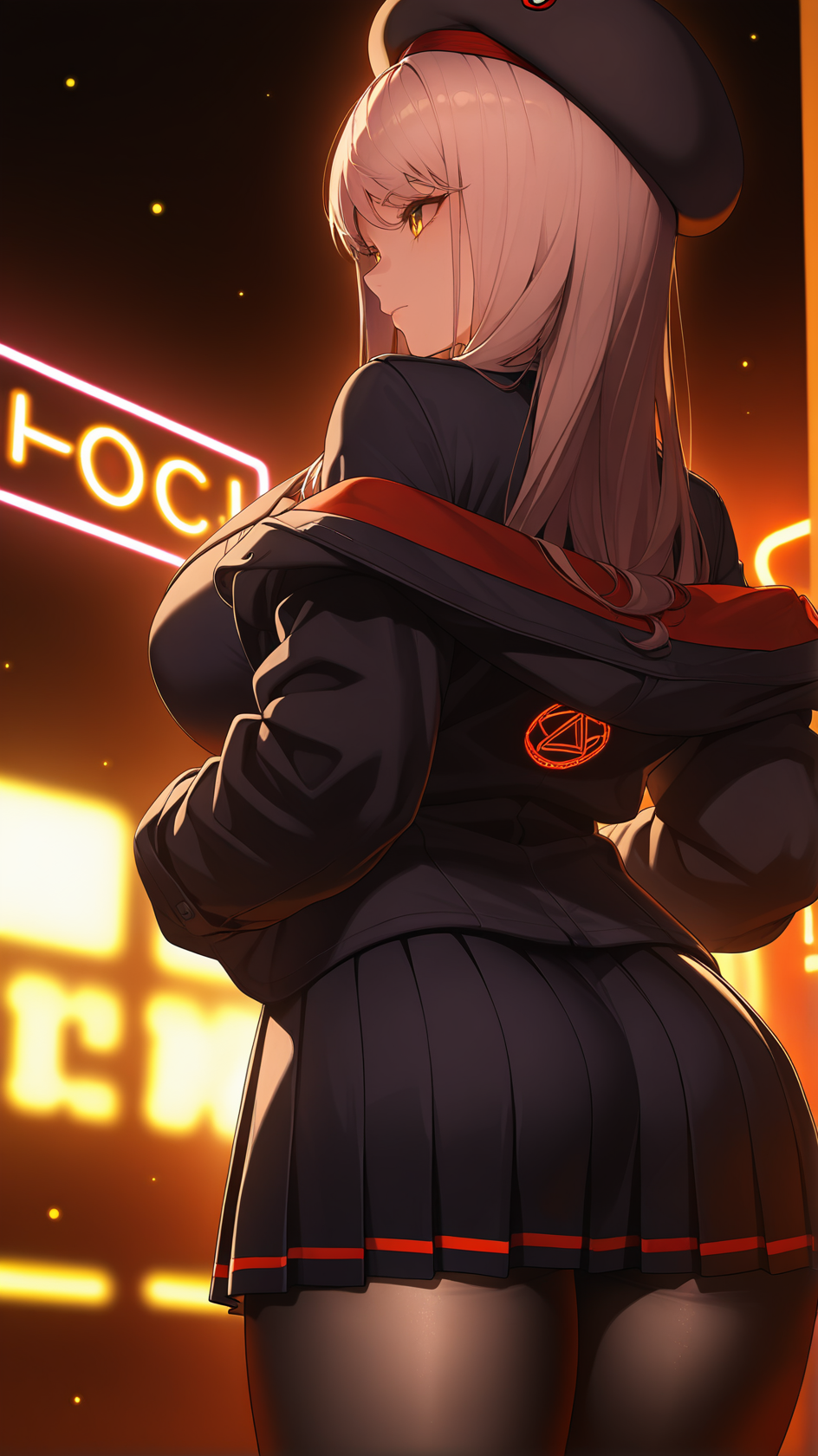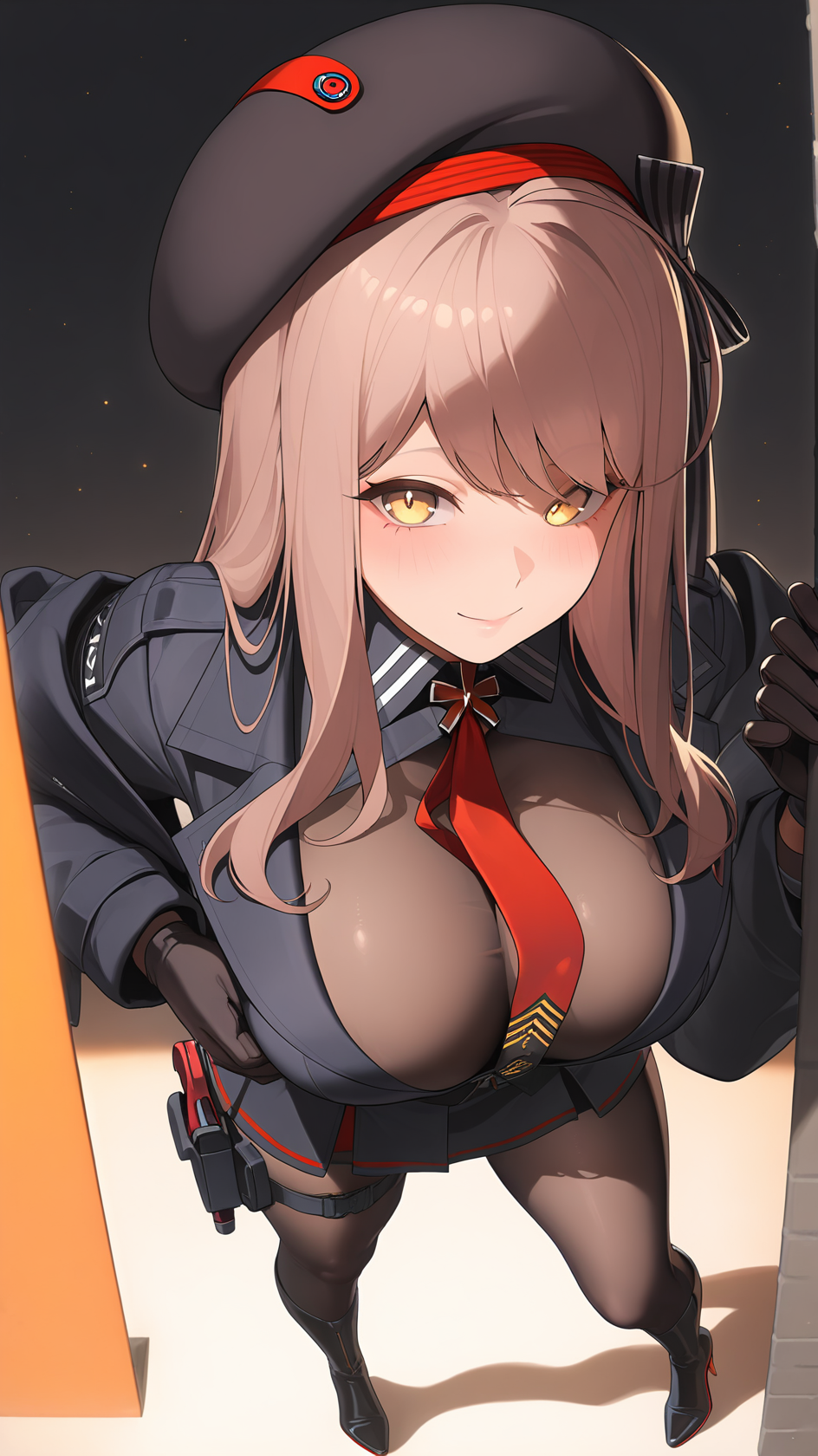 示例提示词:长发,胸部,刘海,大胸部,棕发,手套,长袖,帽子,绿眼,黄眼,夹克,连裤袜,大腿,靴子,露肤,领带,黑手套,黑色头饰,遮盖肚脐,大腿绑带,贝雷帽,及膝靴,红色领带,紧身衣,露肤,腰带,黑色裙子,