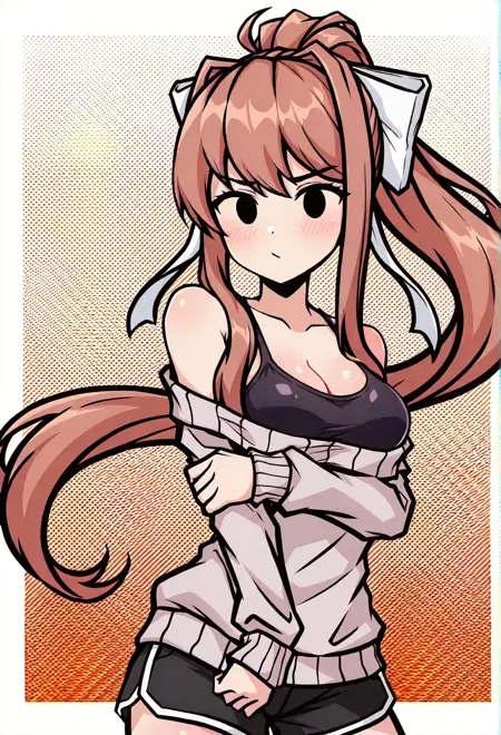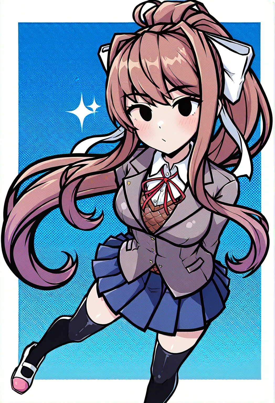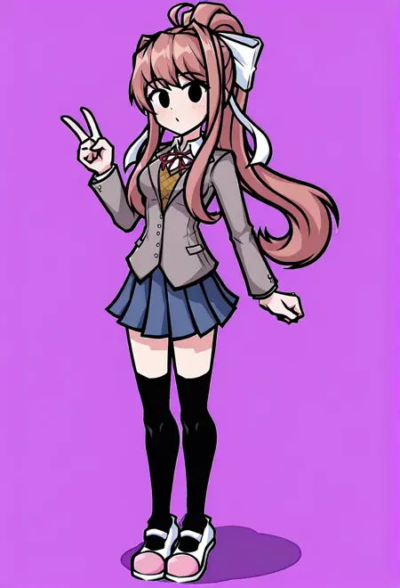 | Trained Words | MonikaDDTO, 1girl, long orange-brown hair tied in a ponytail, white head bow, gray blazer, red neck ribbon, brown vest, white shirt, blue pleated skirt, black thigh-high socks, pink-white shoes, black eyes, no sclera, blunt bags, sidelocks, Monika (doki doki literature club),Copied! MonikaDDTO, 1girl, long orange-brown hair tied in a ponytail, white head bow, cream colored sweater, black undershirt, black shorts, white shoes, black eyes, no sclera, blunt bags, sidelocks, Monika (doki doki literature club),Copied! |
