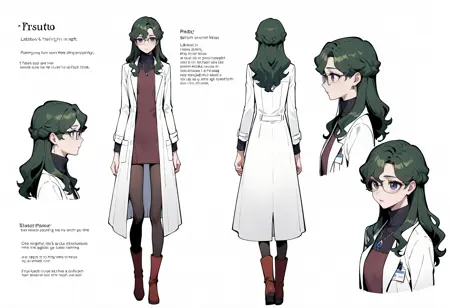 实验室服装: 长发,丝袜,白大褂,靴子,珠宝,连衣裙,项链,高领毛衣,红色鞋履,毛衣,外套,黑色丝袜