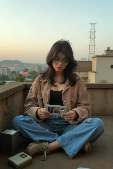 她拥有体现其多元 heritage 的迷人特征——光滑的浅金橄榄色肌肤,在阳光下自然散发出光泽。她的长发略带波浪,呈柔和的深黑棕色,常自由垂落在脸庞与肩头。她佩戴着大而圆的半透明眼镜,赋予她一种沉思甚至诗意的气质。她饱满的双唇轮廓分明,涂着温暖的哑光色唇膏,与柔和的面部线条形成优雅对比。她戴着一枚精致的鼻环,为她整体宁静的气质增添了一丝微妙的个性。