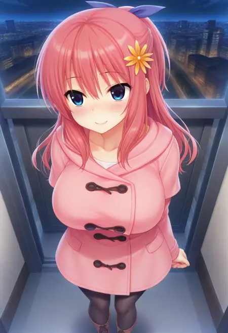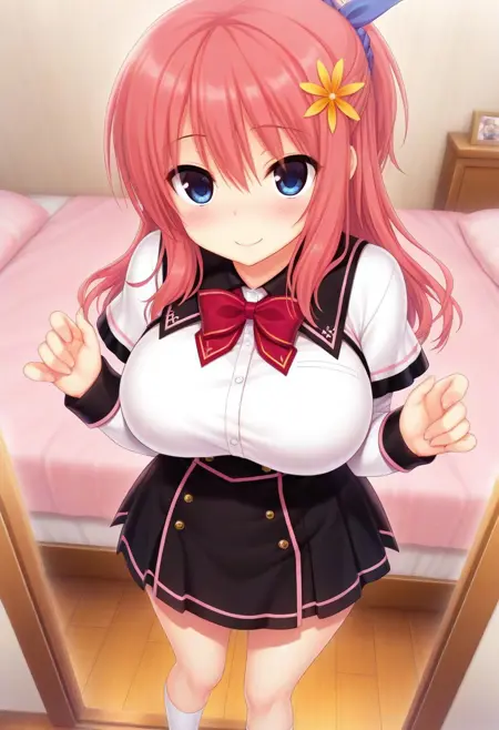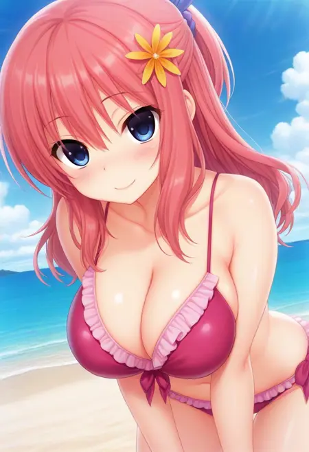Recommend Prompt:Karen Watanuki, blue eyes, pink hair, long hair, half-up with ribbon, flower hair ornament,