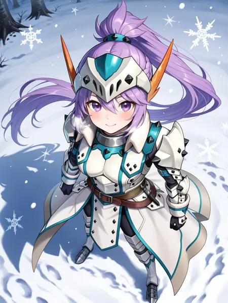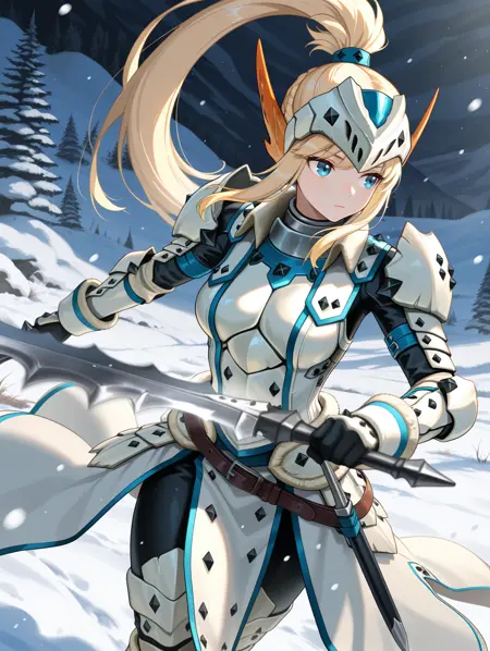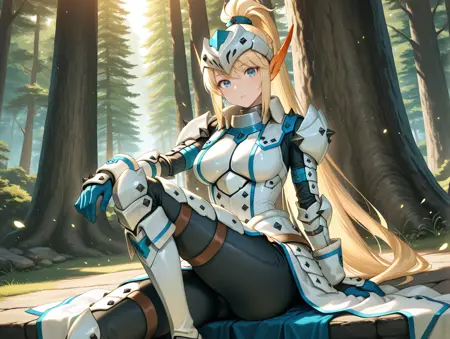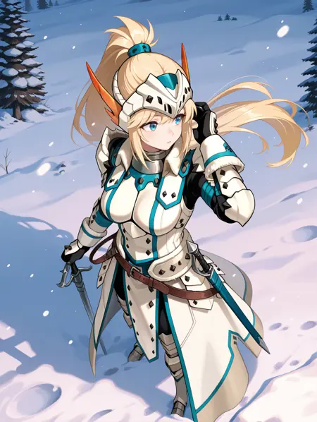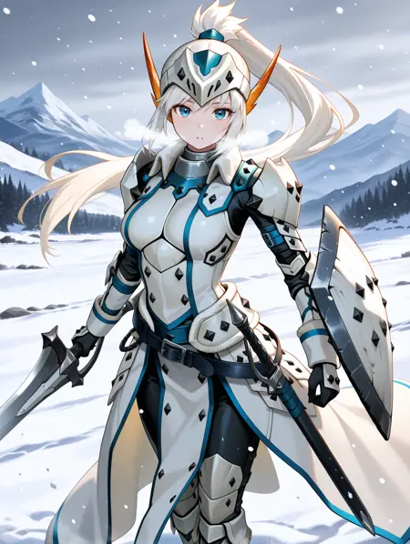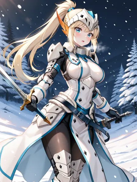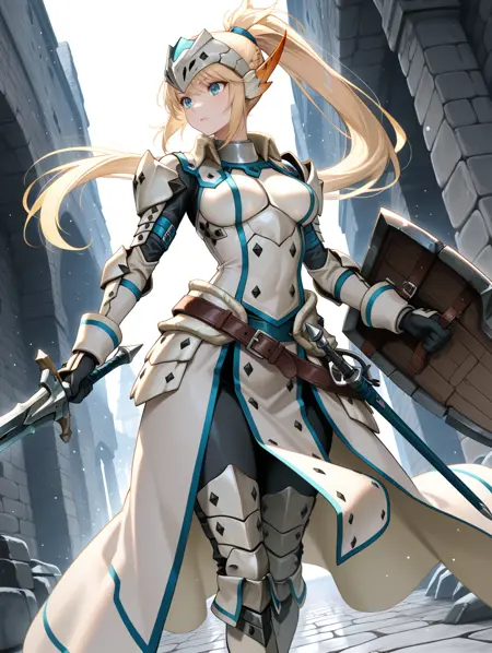 태그(옷): 바리오스 X 갑옷, 흰색 헬멧, 흰색 장갑, 흰색 코트 드레스, 흰색 어깨 보호대, 흰색 갑옷 부츠, 폰테일, 전체 갑옷,