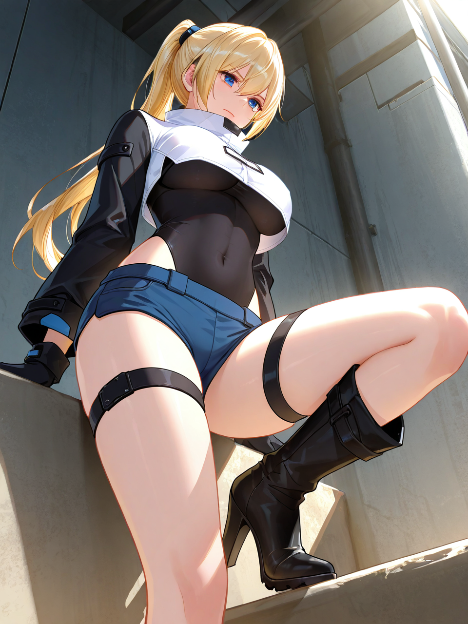 baoyue, 1girl, solo,blue eyes, blonde hair, shorts, black gloves, ponytail, leotard, black leotard, covered navel,long hair, leotard under clothes, black footwear, long sleeves, thigh strap, short shorts, boots, blue shorts, hair between eyes, cropped jacket, crop top, highleg, crop top overhang, high heel boots, white jacket,black sleeves