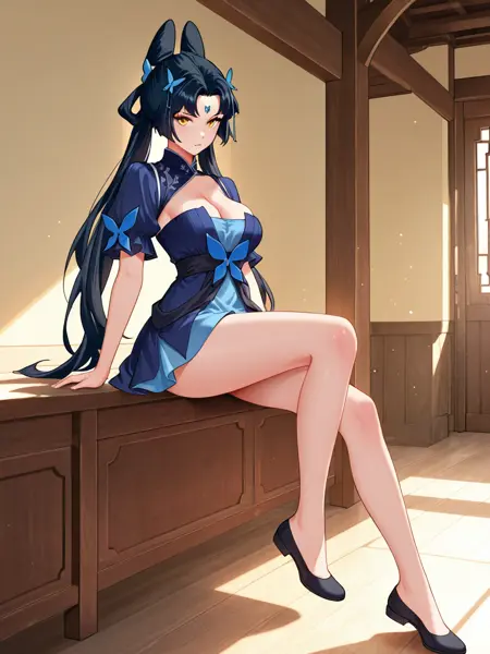 moyaoer, 1girl, breasts, solo, black hair, long hair,cleavage, black footwear, puffy short sleeves,blue dress, parted bangs, bare legs, short dress, twintails, tattoo,butterfly hair ornament, hair rings, flats, yellow eyes, forehead jewel, facial mark, forehead mark