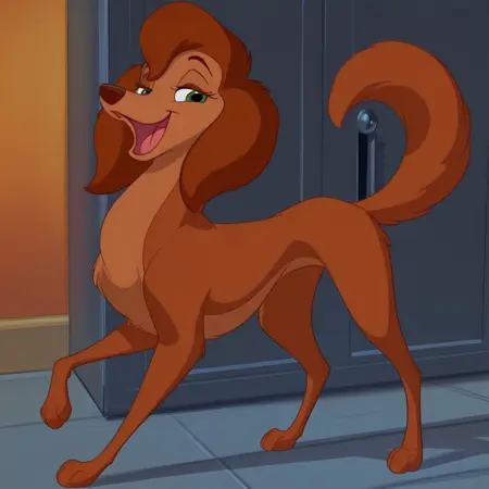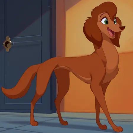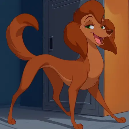 sasha, female, dog, disney, irish setter, orange-brown fur, light orange-brown belly, brown hair, green eyes
