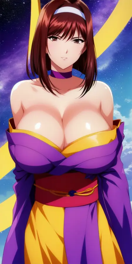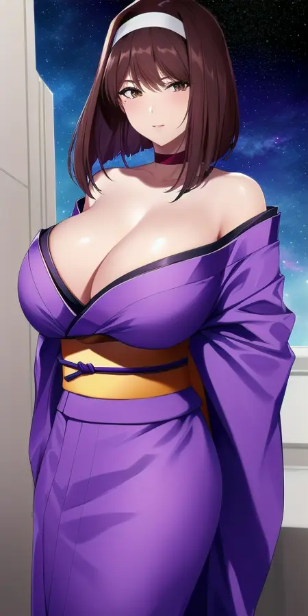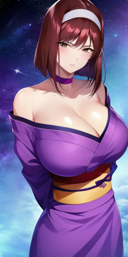 purple_strapless_kimono_yellow_sash_yellow_back_bow_red_ribbon_choker_white_hairband_floral_print: 그녀의 일반적인 기모노 복장. 가끔 SD가 꽃무늬를 추가하지 않으려 하는데, 왜 그런지는 모르겠다.