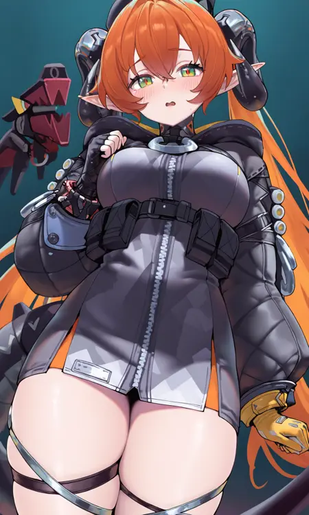 orphie \(zenless zone zero\), 1girl, horns, tail, white background, solo, thighhighs, simple background, pointy ears, long hair, gloves, twintails, orange hair, orange gloves, jacket, black thighhighs, black jacket, green eyes, long sleeves, skindentation, two-tone gloves, mechanical tail,
