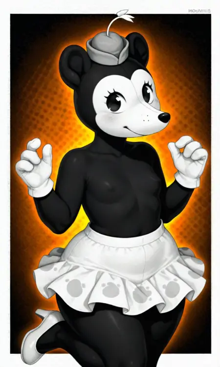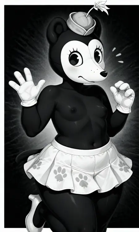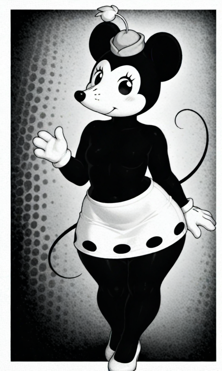 태그: 1938minnie, 인간형, 검은 몸통, 흰 얼굴, 만화 눈, 쥐 귀, 흰 작은 모자, 흰 치마, 점박이 치마, 흰 장갑, 흰 구두, 4 지락, 못생김, 검은 상체, 긴 코