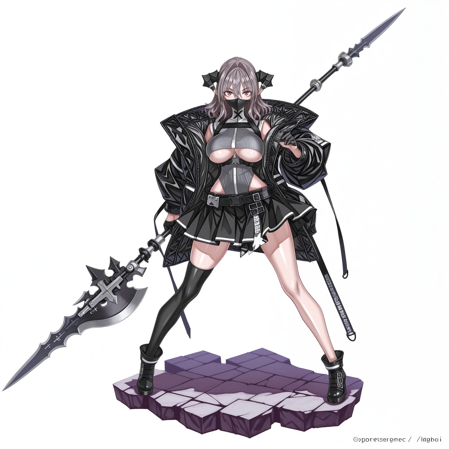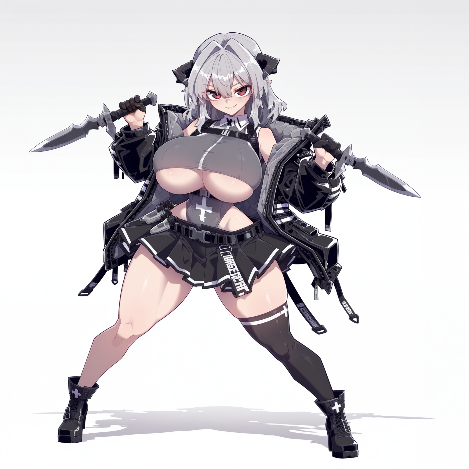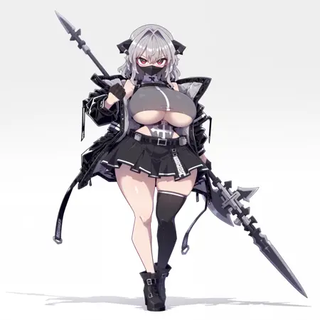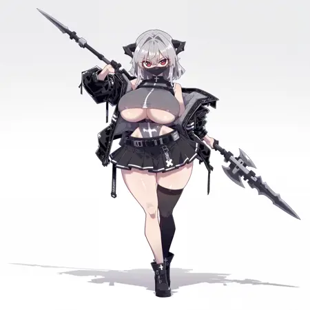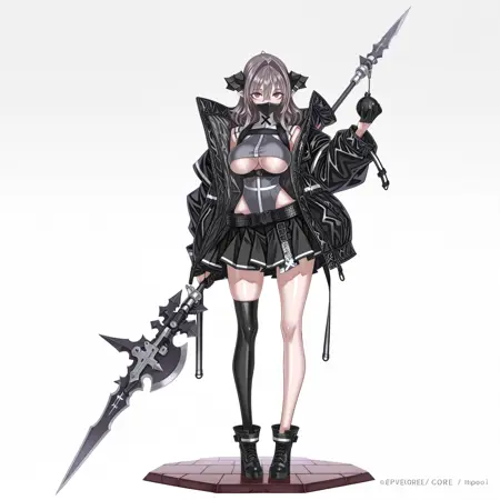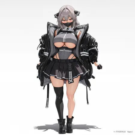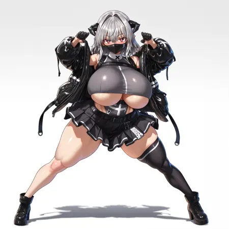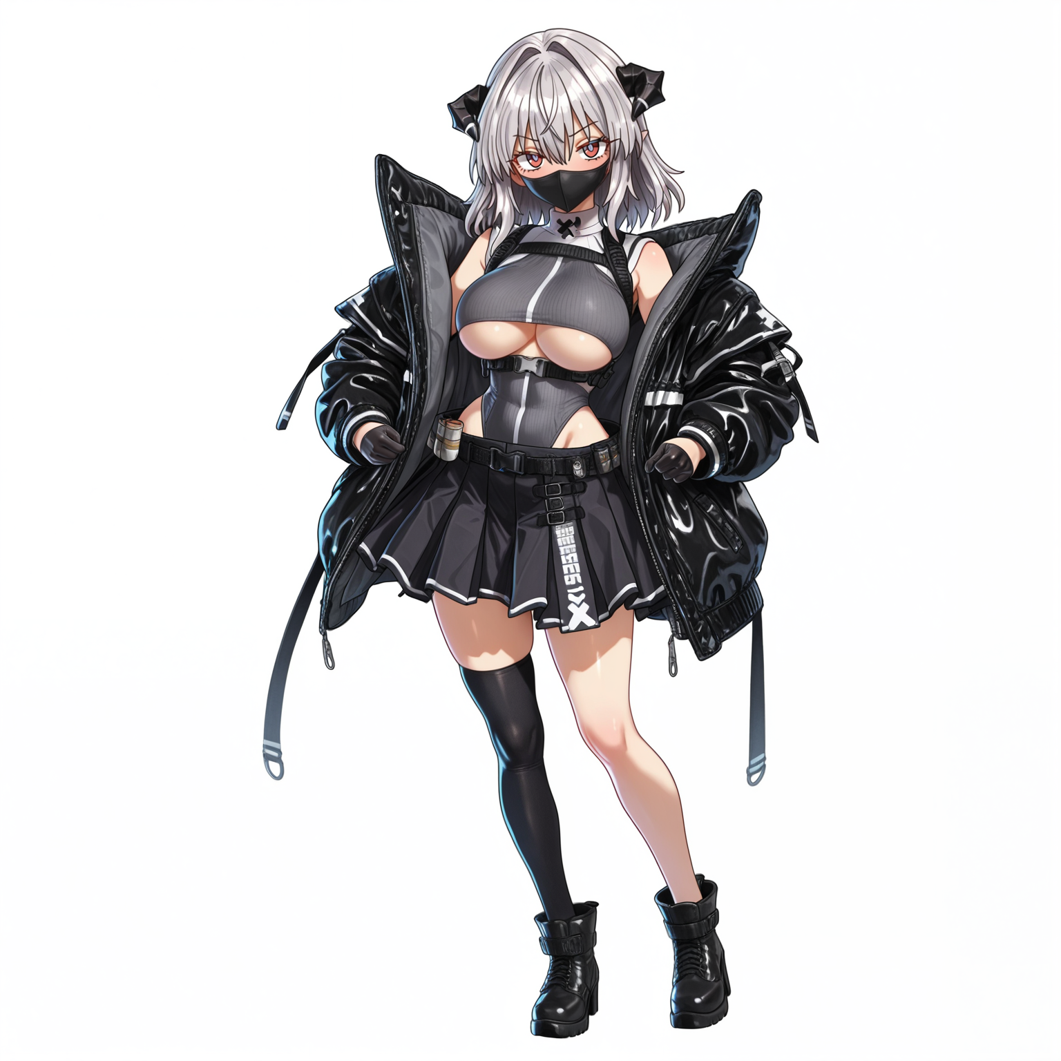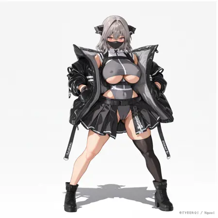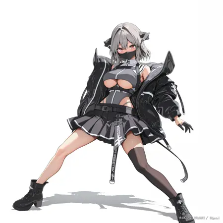 角色服装:白领,黑手套,半截手套,黑色夹克,敞开式夹克,无袖衬衫,露出下胸,短款衬衫,灰色紧身衣,十字图案,印花紧身衣,高开叉紧身衣,胸带,腰带,黑色腰带,黑色裙子,褶裙,(单腿长筒袜),黑色靴子,踝靴,