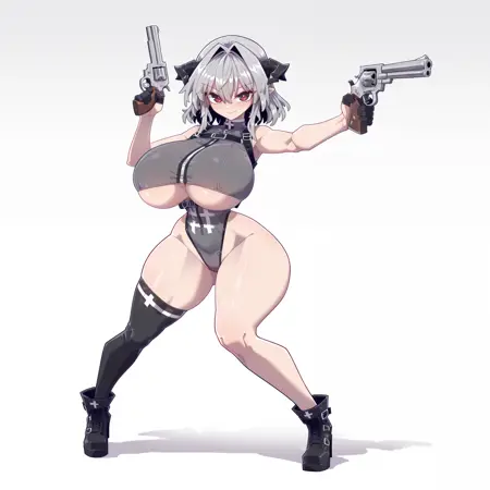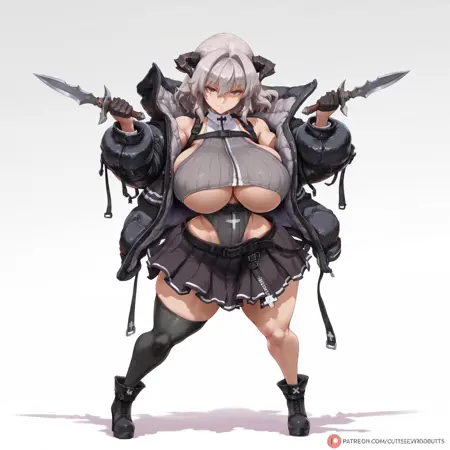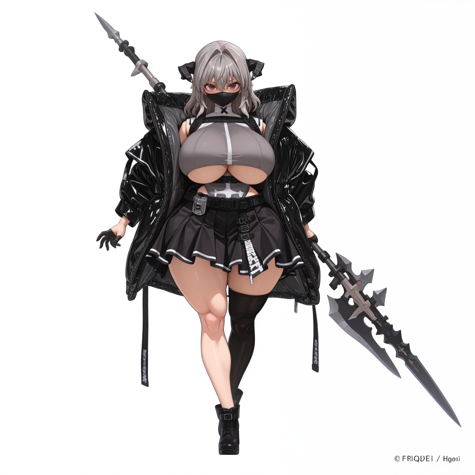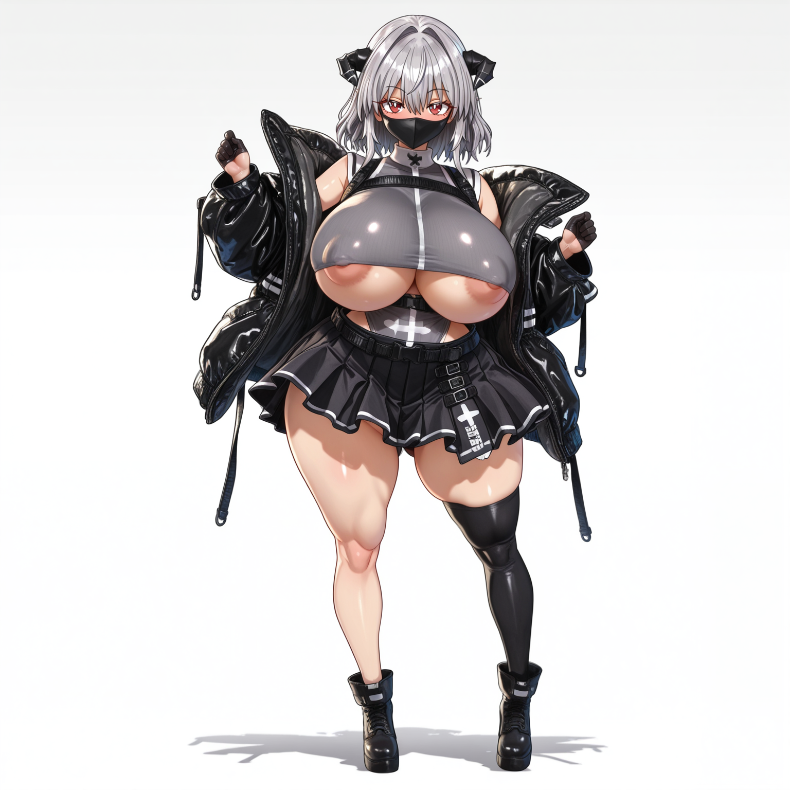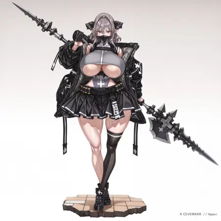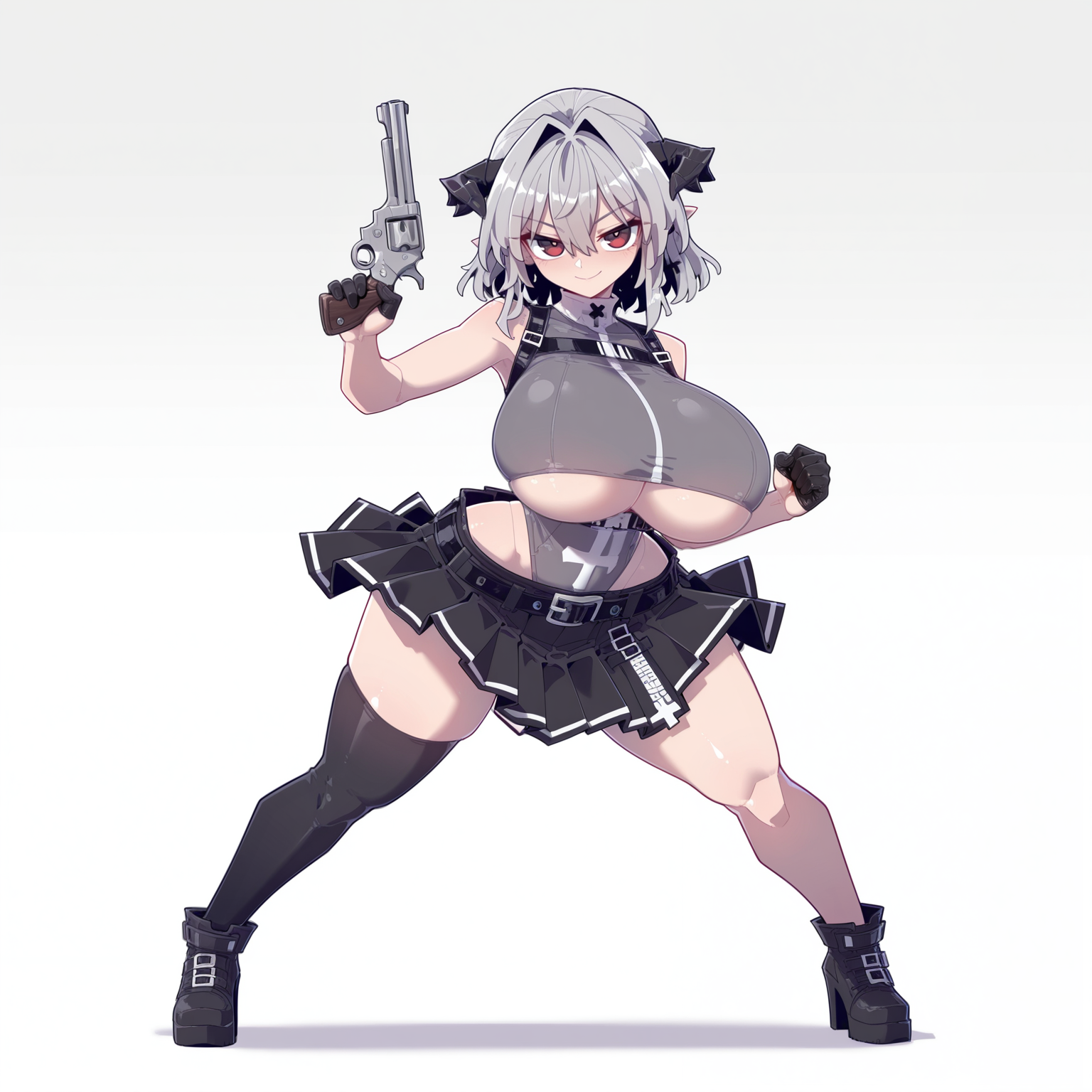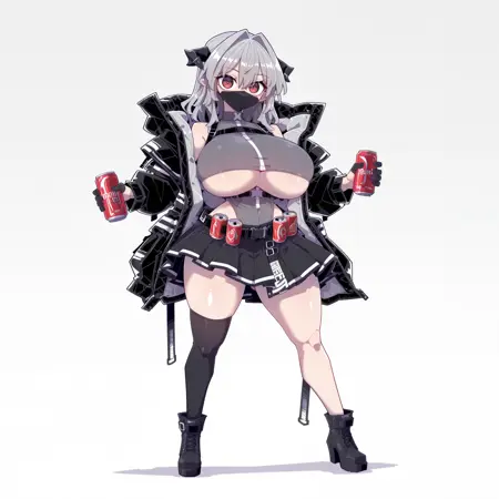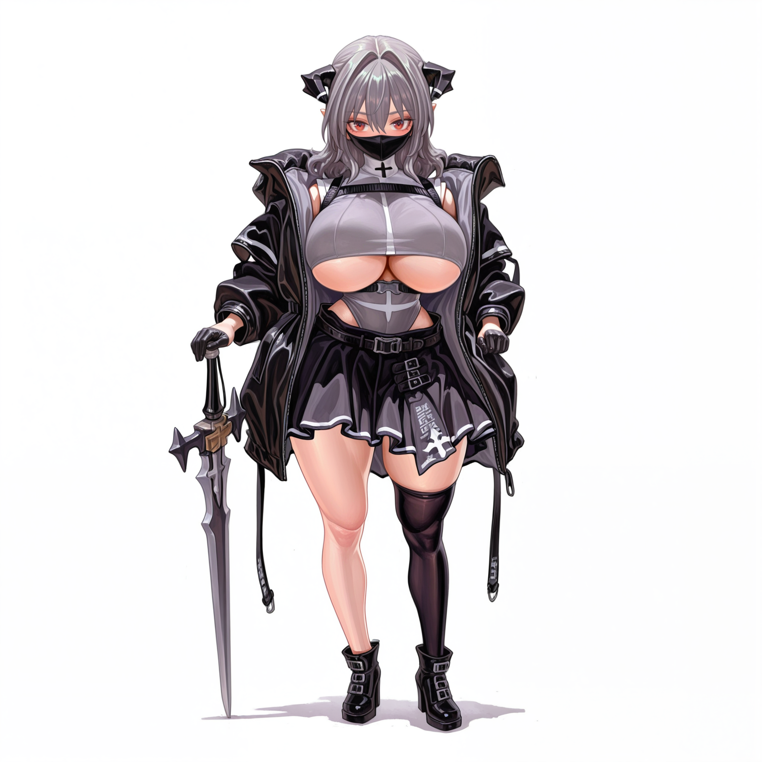 角色服装:白领,黑手套,半截手套,黑色夹克,敞开式夹克,无袖衬衫,露出下胸,短款衬衫,灰色紧身衣,十字图案,印花紧身衣,高开叉紧身衣,胸带,腰带,黑色腰带,黑色裙子,褶裙,(单腿长筒袜),黑色靴子,踝靴,