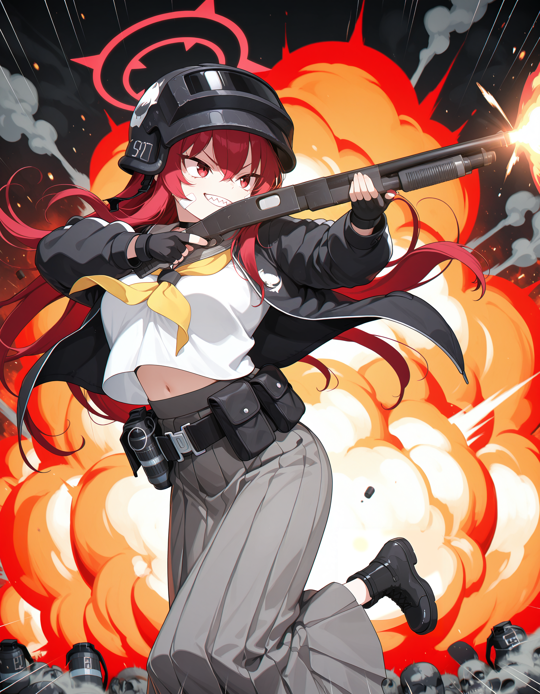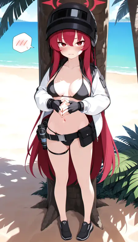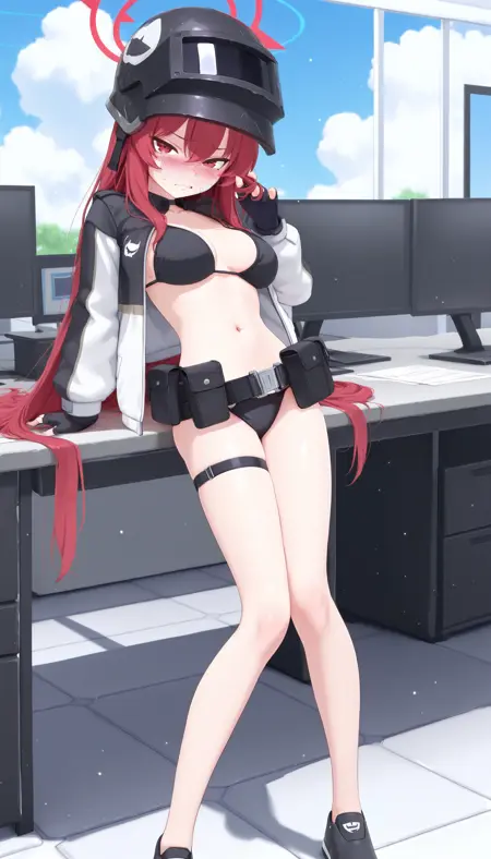 黑色Altyn头盔, 黑色比基尼, 绳式比基尼, 腹部, 肚脐, 白色夹克, 双色夹克, 膨胀长袖, 开襟夹克, 骷髅图案, 黑色无指手套, 大腿绑带, 裸腿, 黑色运动鞋,