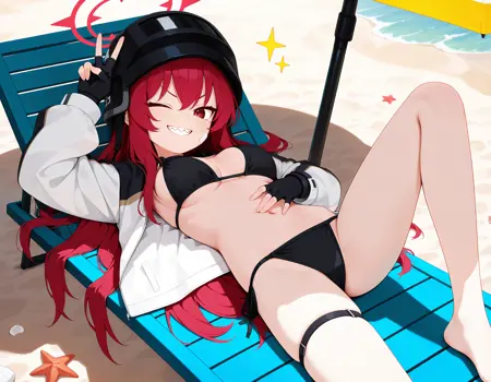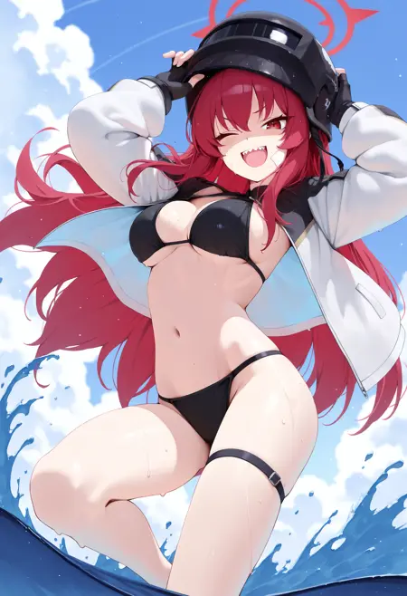 swimr4bu, 红发, 长发, 侧发, 发丝遮眼, 红色光晕, 红眼, 吊眼, 面部创可贴, 中等胸围, 尖牙,