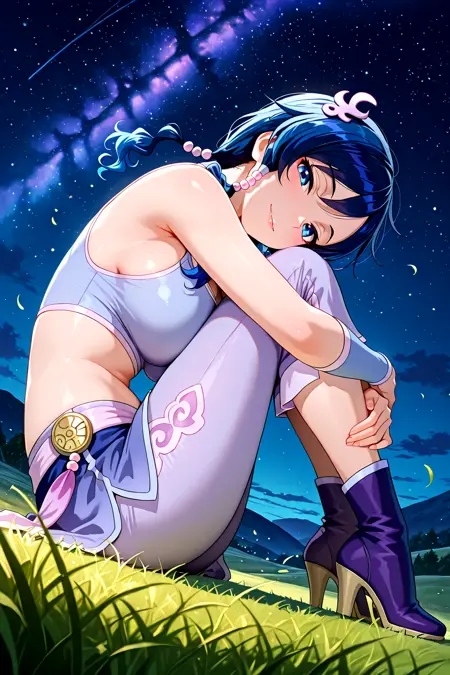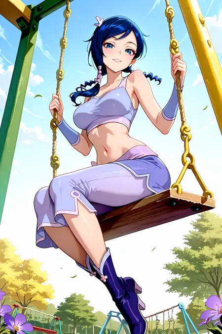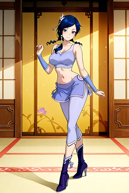 xiao long mei, tri tails, tri braids, blue hair, blue eyes, hair ornament, violet vest, violet pinching sleeves, short pinching sleeves, midriff, violet skirt, miniskirt, violet capri pants, violet boots, high heel boot