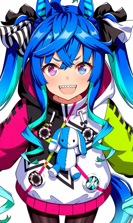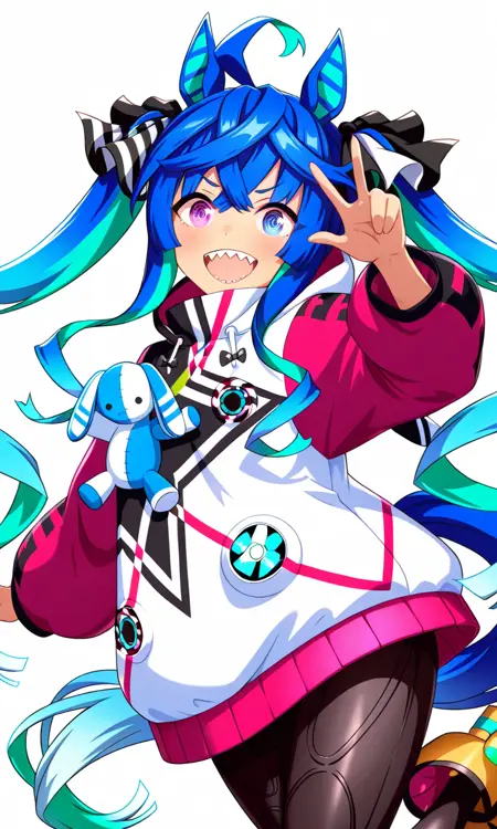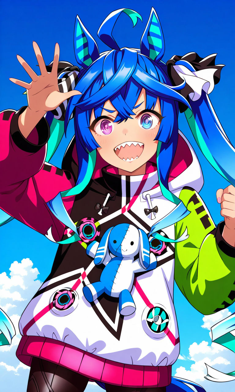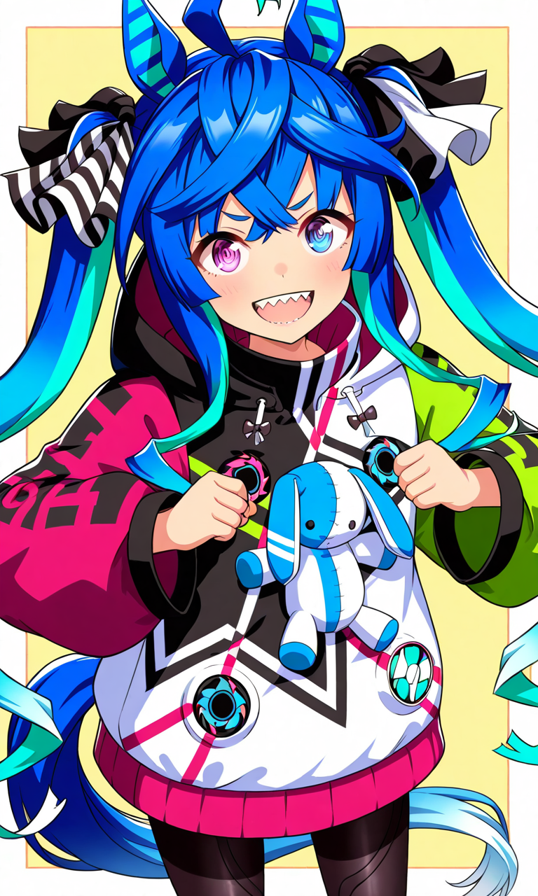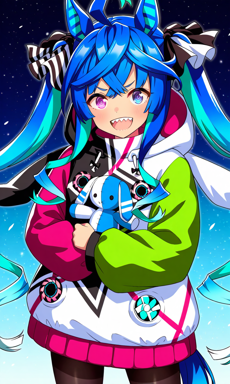 트윈 터보 \(우마무스메\), 말 꼬리, 날카로운 이빨, 이색 머리카락, 파란 머리카락, 청록색 머리카락, 아호게, 교차된 앞머리, 측면 머리카락, 더블 테일, 머리 리본, 말 귀, 이채색 안녕, 보라색 눈, 파란색 눈, @ @, 다채로운 코트, 후드 코트, 끈, 긴 소매, 검은 팬티스타킹, 장난감, 인형 토끼