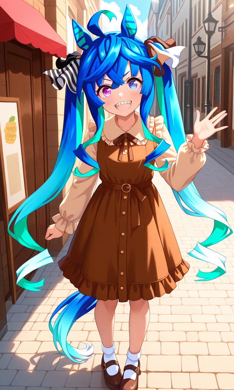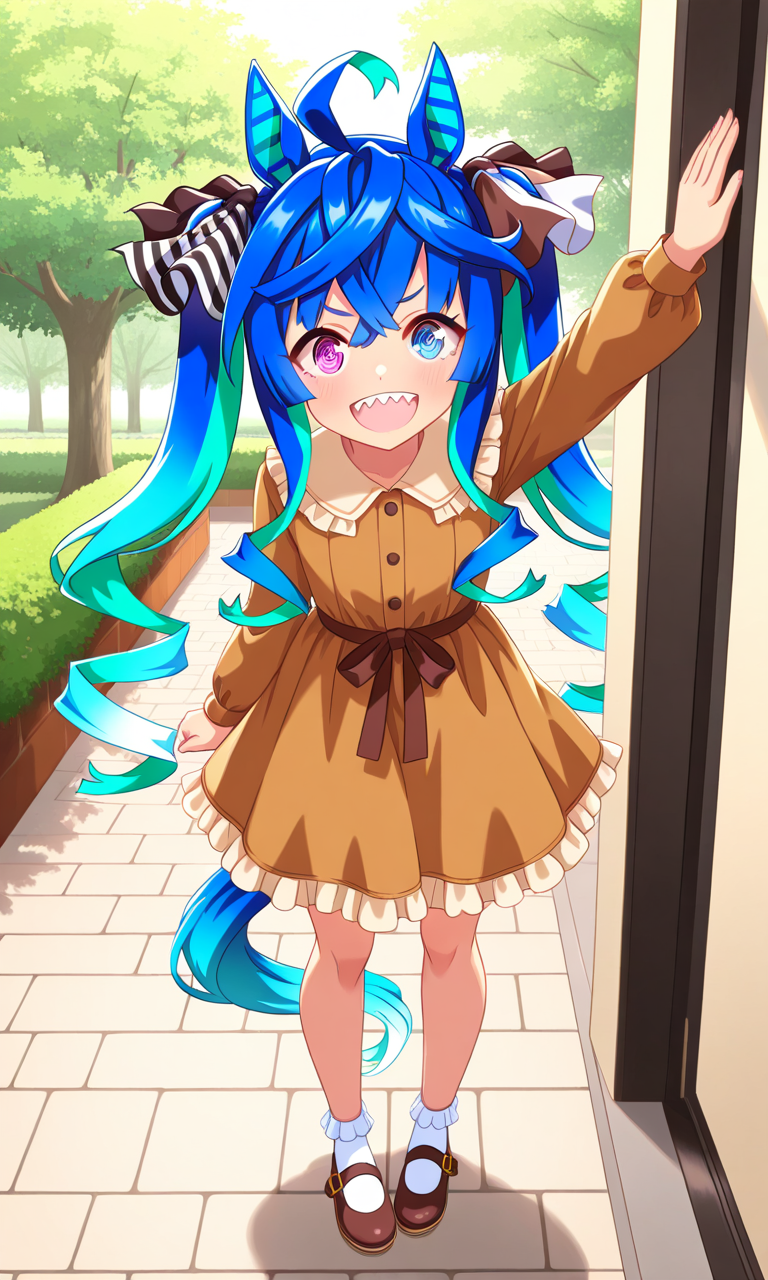 트윈 터보 \(우마무스메\), 말 꼬리, 날카로운 이빨, 이색 머리카락, 파란 머리카락, 청록색 머리카락, 아호게, 교차된 앞머리, 측면 머리카락, 더블 테일, 머리 리본, 말 귀, 이채색 안녕, 보라색 눈, 파란색 눈, @ @, 캐주얼, 머리띠, 머리 리본, 갈색 리본, 긴 소매, 칼라 있는 드레스, 갈색 드레스, 프릴 있는 드레스, 프릴, 흰색 양말, 갈색 신발, 메리제인