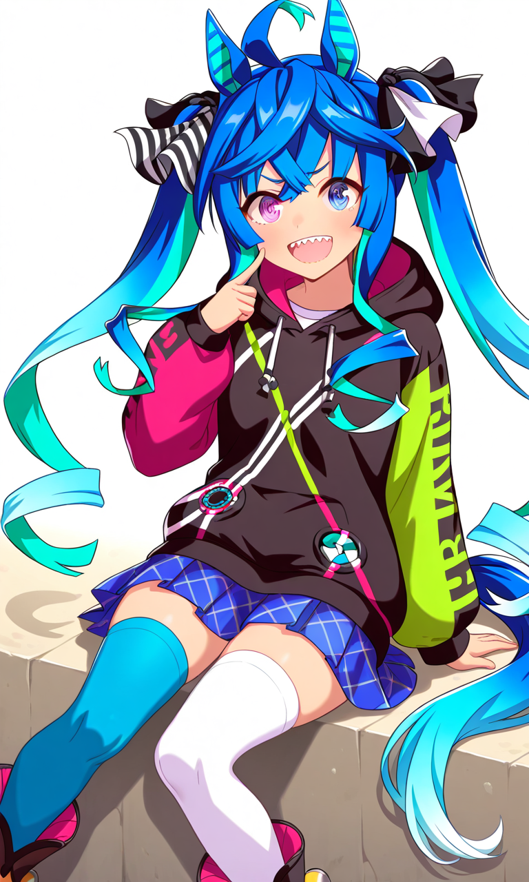 트윈 터보 \(우마무스메\), 말 꼬리, 날카로운 이빨, 이색 머리카락, 파란 머리카락, 청록색 머리카락, 아호게, 교차된 앞머리, 측면 머리카락, 더블 테일, 머리 리본, 말 귀, 이채색 안녕, 보라색 눈, 파란색 눈, @ @, 긴 소매, 상반신, 후드, 후디, 검은 리본, 후드 아래로, 다채로운 옷, 치마, 허벅지 양말, 주름 치마, 부츠, 미니 치마, 검은 신발, 흰색 허벅지 양말 파란 치마, 체크 무늬 체크 치마, 비대칭 하의, 끈, 파란 허벅지 양말, 검은 후디, 불일치한 하의,