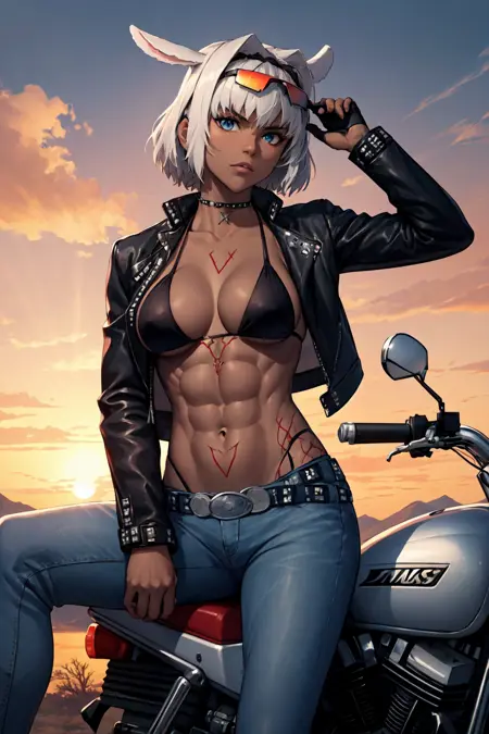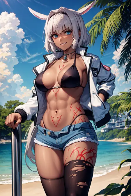 - "CasualRider, dog tags, white jacket, open jacket, bare shoulders, black bikini, denim shorts, short short, open fly, single thighhigh, black thighhighs, torn thighhighs"