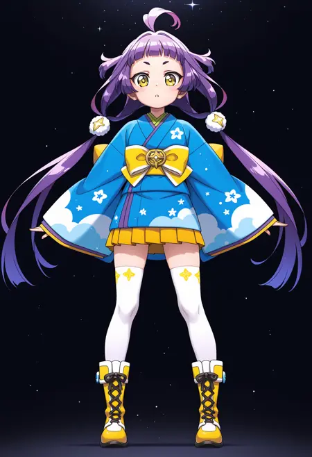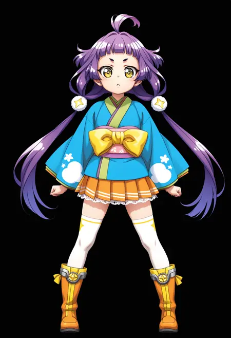 1girl, solo, kaguya-fow, aged down, purple hair, yellow eyes, long hair, ahoge, twintails, bangs, blunt bangs, hime cut