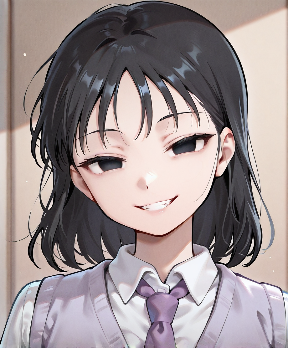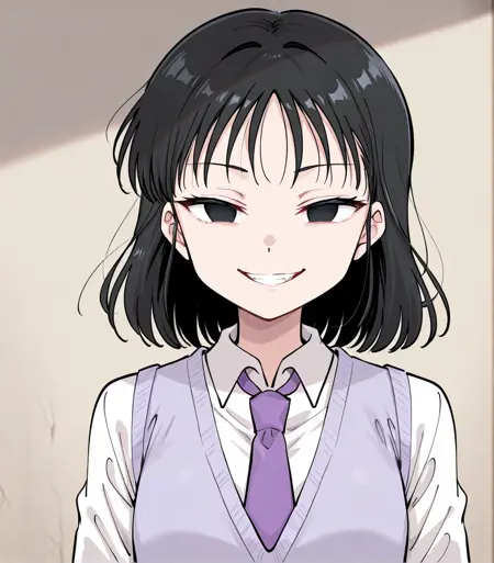 有益提示:黑发,黑眼,空洞的眼神,微笑,邪恶的笑,浅紫色背心
