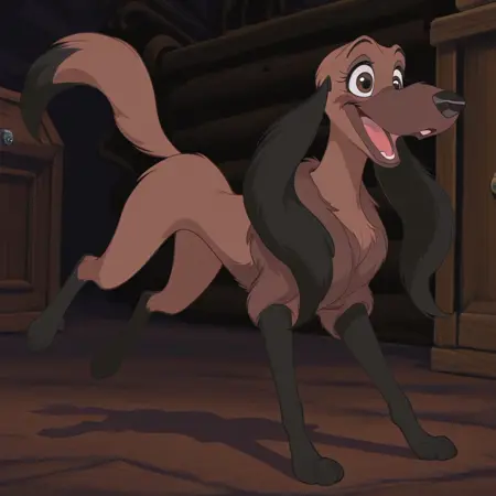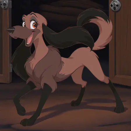 ruby, female, dog, disney, afghan hound, brown fur, dark brown chest fur, black ears, black legs, brown eyes