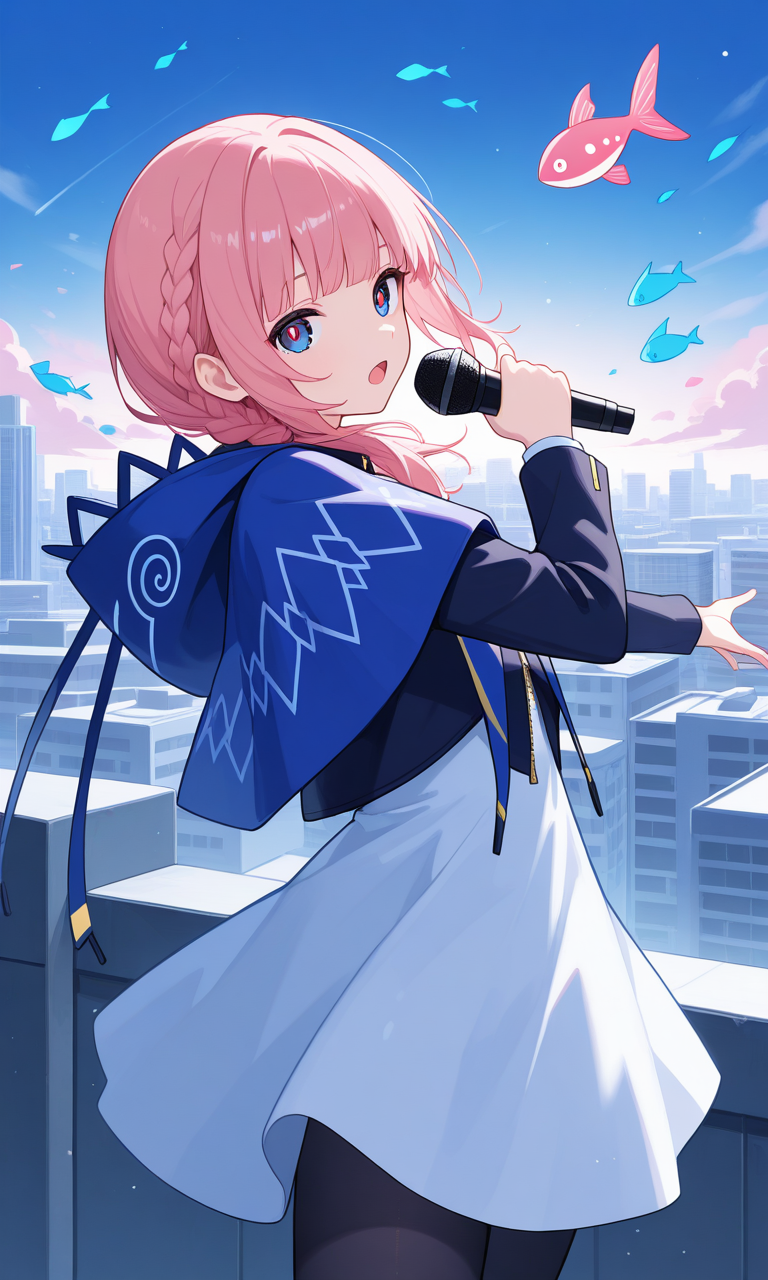 • k4f tsubame, pink hair, long hair, ponytail, braid, hooded jacket, hood down, blue jacket, multicolored jacket, layered sleeves, white shirt, collared shirt, neck ribbon, red ribbon, blue skirt