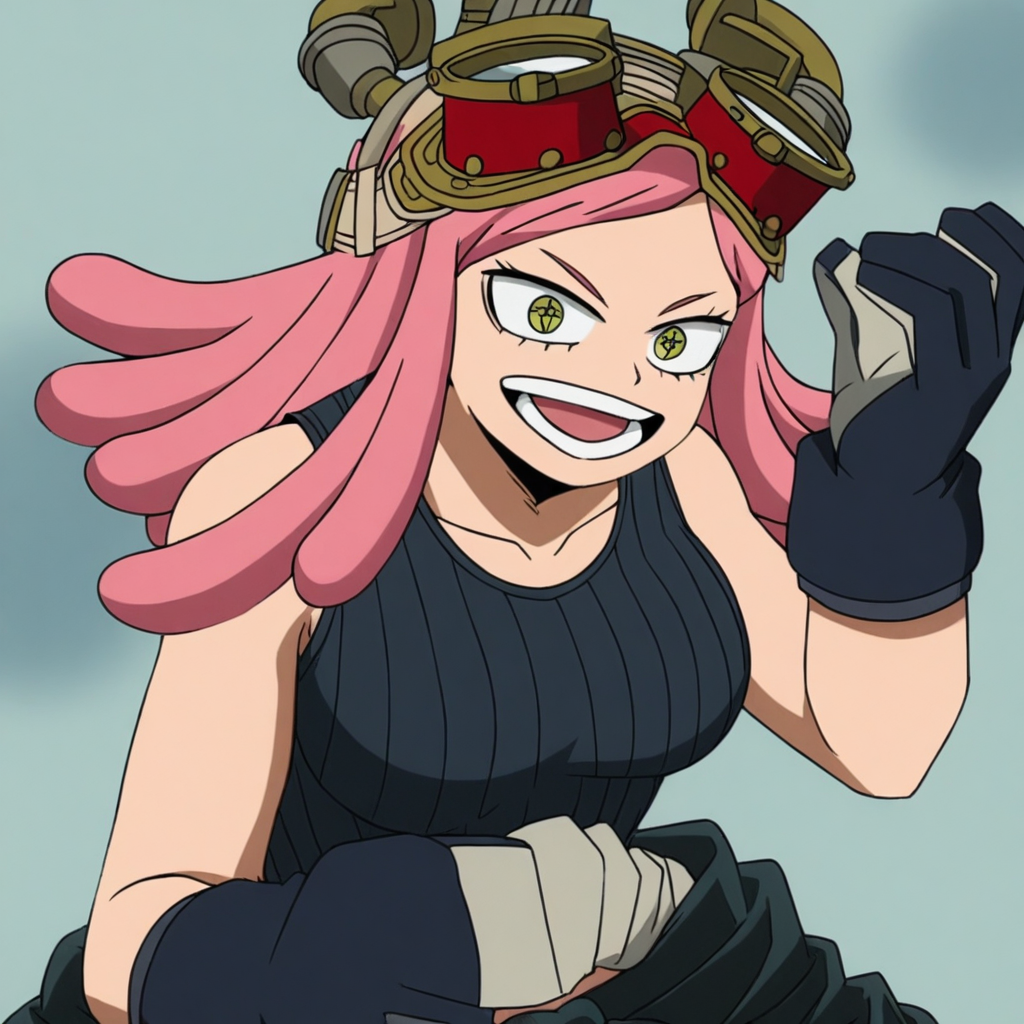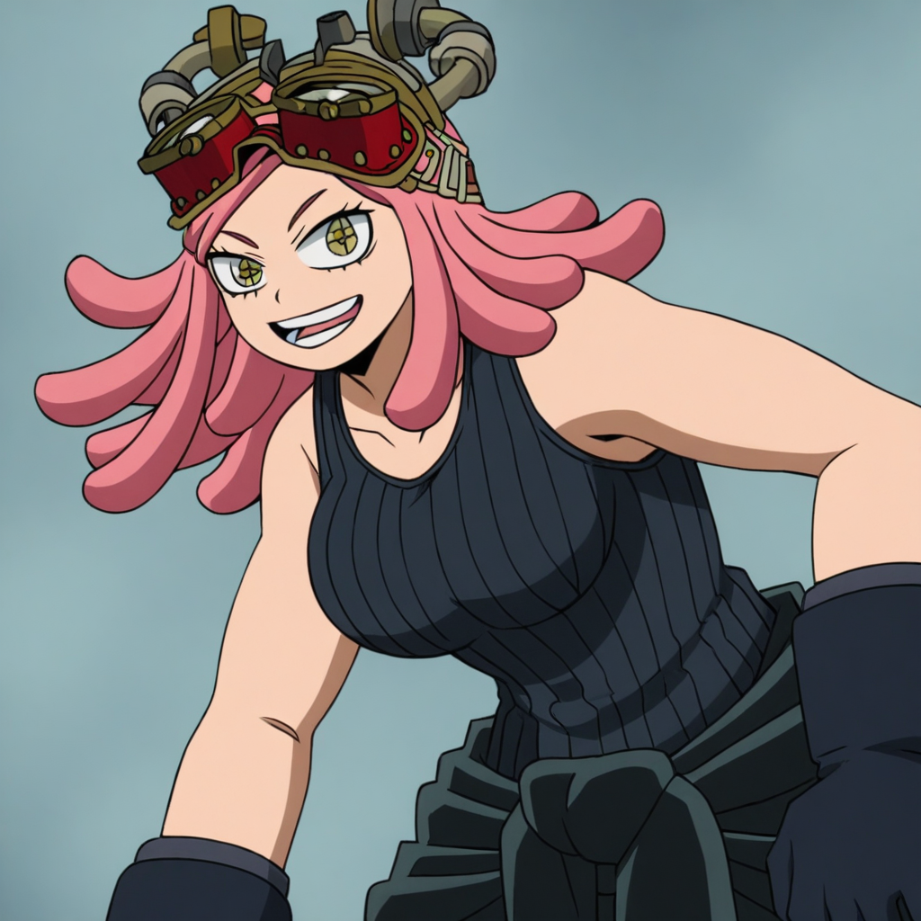 メイ・ハツメ、1人女孩、単体、ミディアムヘア、ピンク色の髪、ダレロック、頭にゴーグル、黄色い目、十字型の瞳孔、黒いタンクトップ、リブシャツ、黒い手袋、大きな胸