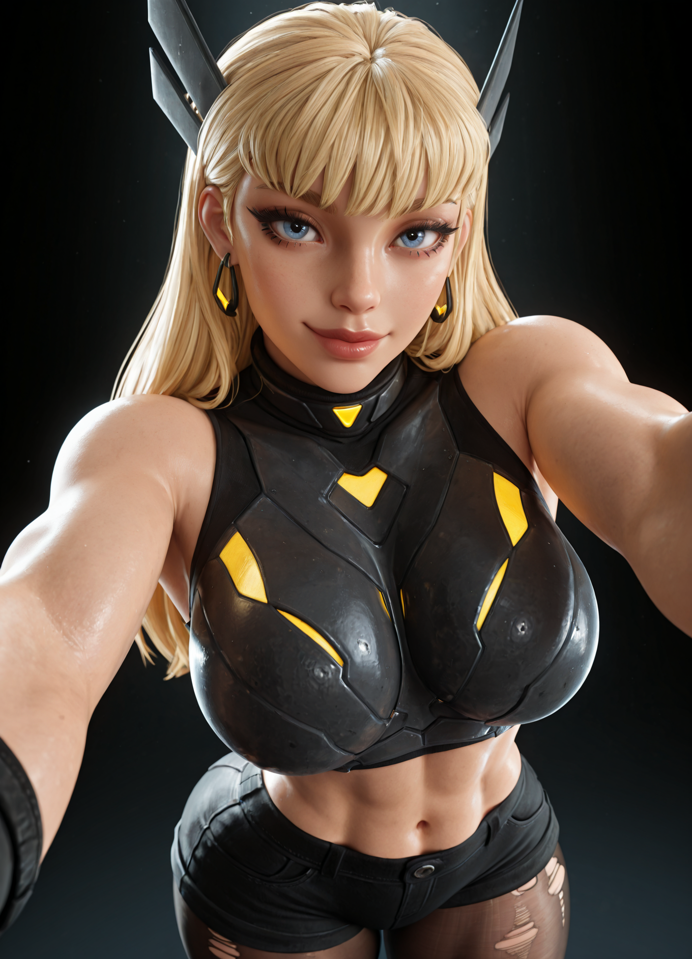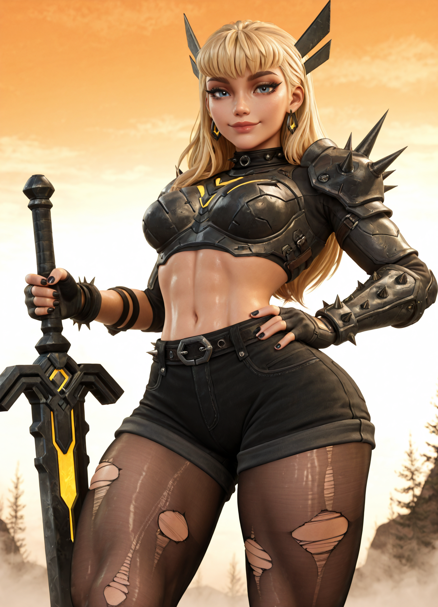 blonde hair, blue eyes, gloves, long hair, jewelry, black shorts, earrings, armor, ripped pantyhose, bare arms,