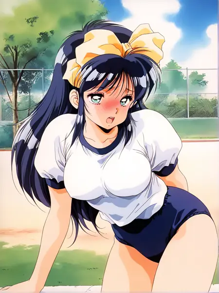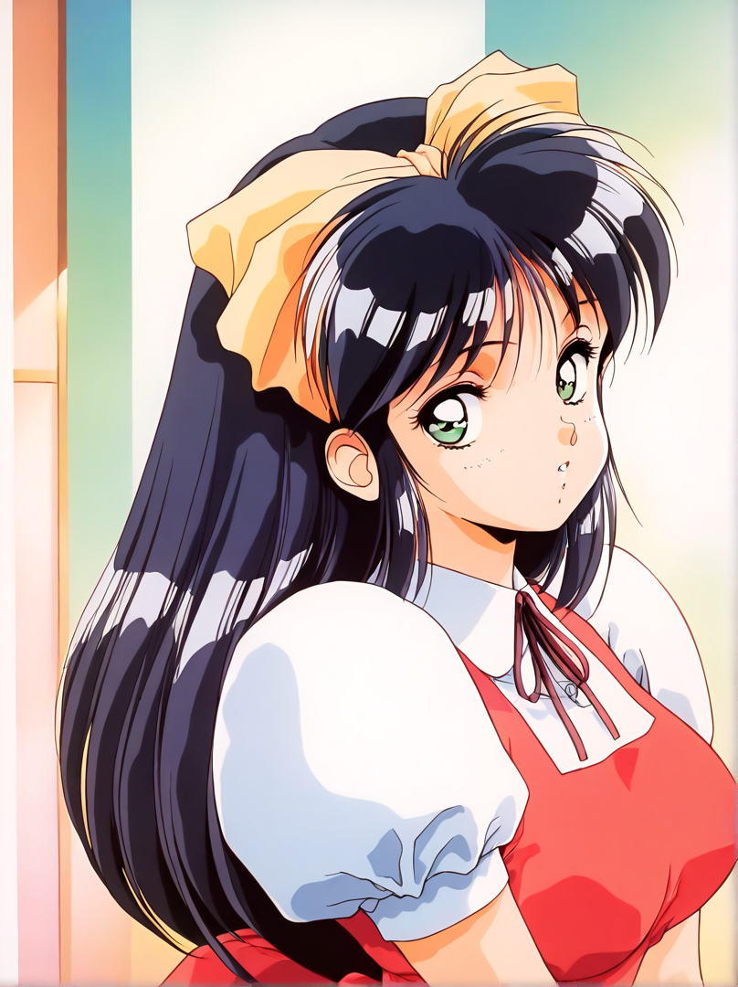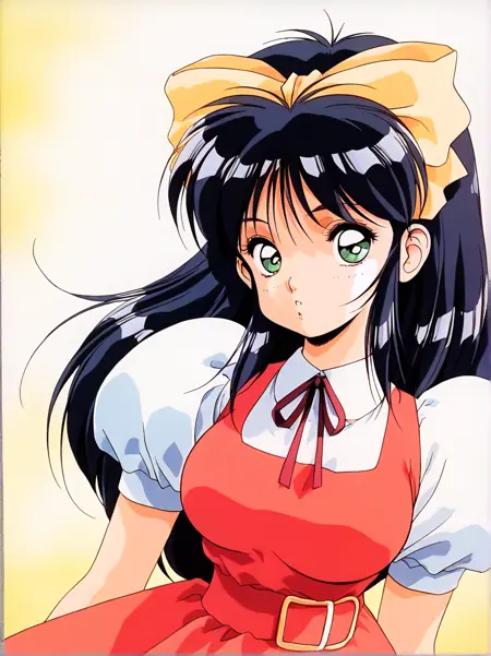 Onee-chan(konai-shasei), 1girl, black hair, long hair, hair Yellow ribbon, green eyes, large breasts,