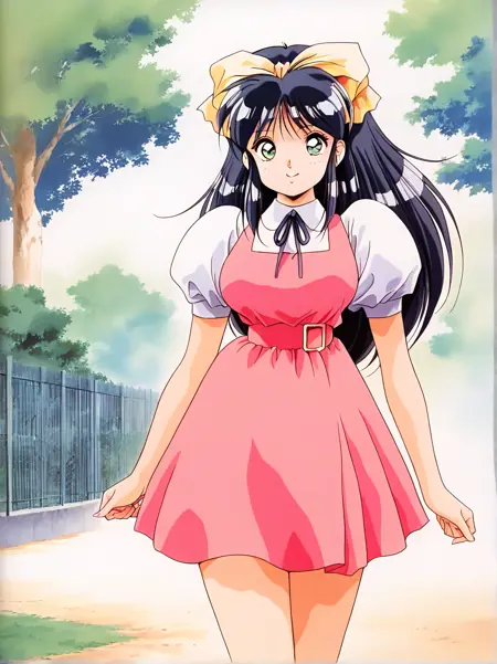 white shirt,ribbon tie,puffy_sleeves, short_sleeves, pink dress, pinafore dress, pink skirt,miniskirt,