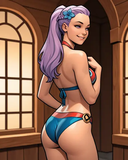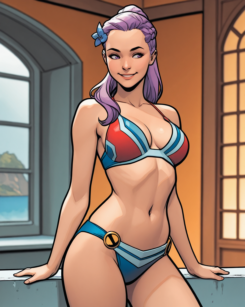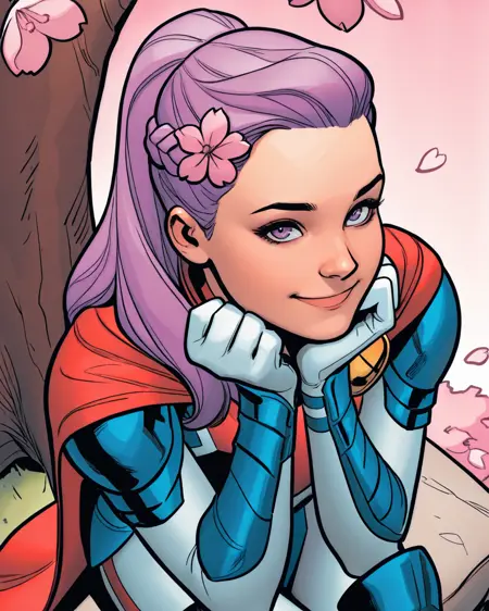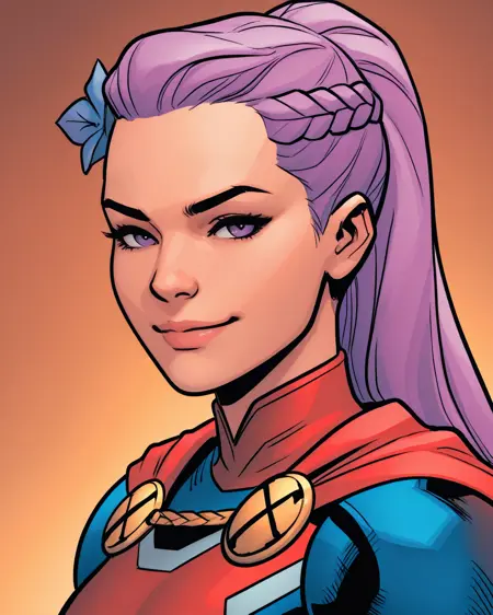トリガー: betsycapbritain, 紫色の髪, 紫色の目, ポニーテール, 髪飾り, 編み髪, アーマー, ケープ, ブーツ