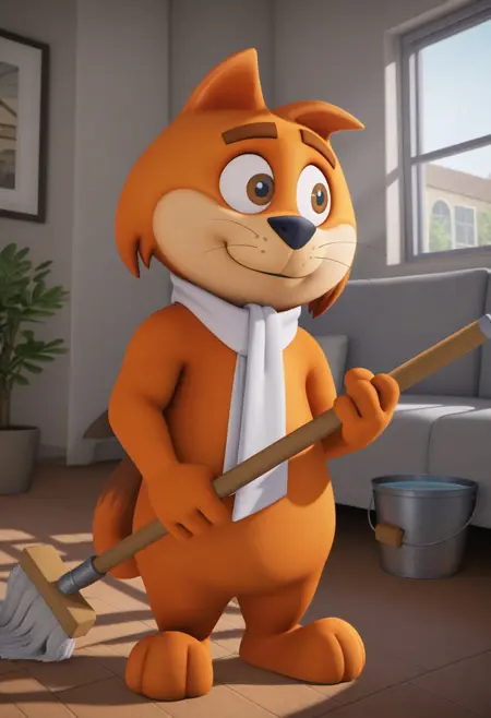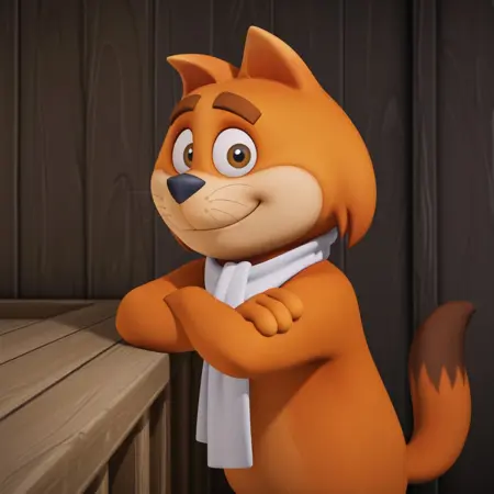 タグ(2011年): 2d, 2d(アートワーク), 猫科, 猫, 男性, オレンジ色の毛, 二色の毛, 黒い鼻, ひげ, ベージュ色の吻部, 黒い眉毛, 厚い眉毛, 黒い目, 尾, ディップスティック尾, 白い尾の先端, 白いスカーフ
