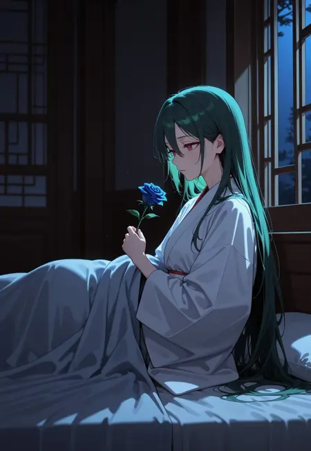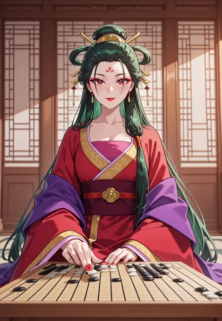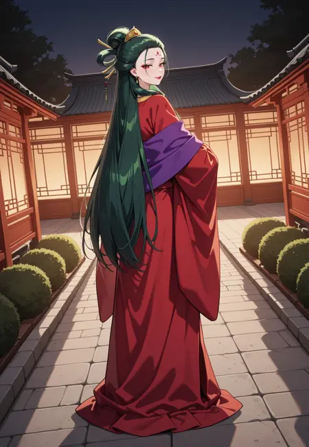| トレーニングワード | ADFengX, 1girl, green hair, very long hair, hair pulled back, loose hair strand, half updo, single hair bun, hair rings, hair half over shoulder, single hair tube, red eyes, red lipstick, red eyeshadow, red forehead mark,コピーしました! tiara, chinese hairpin, teardrop earrings,コピーしました! hanfu, red kimono, wide sleeves, long sleeves, purple shawl, dark red sashコピーしました! |