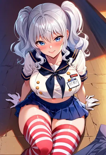 | 训练词汇 | Base: Kashima, twin tails, long hair, silver hair, blue eyes, pale skin, large breasts,已复制! Outfit: black hair ribbon, sailor collar, navy blue bow, white cropped jacket, gold buttons, navy blue pleated skirt, thigh-high stockings, white gloves, (red-white striped stockings),已复制! |