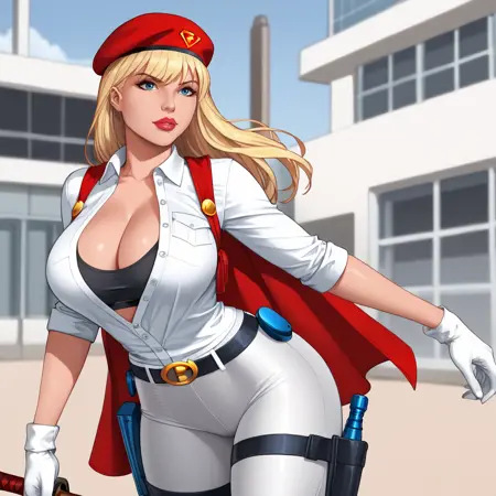 Trigger : SupergirlWhite, 1girl, solo, midriff, blonde hair, crop top, white gloves, cropped shirt, skirt, blue eyes, navel, cape, miniskirt, long hair, large breasts, lips, hairband, cowboy shot