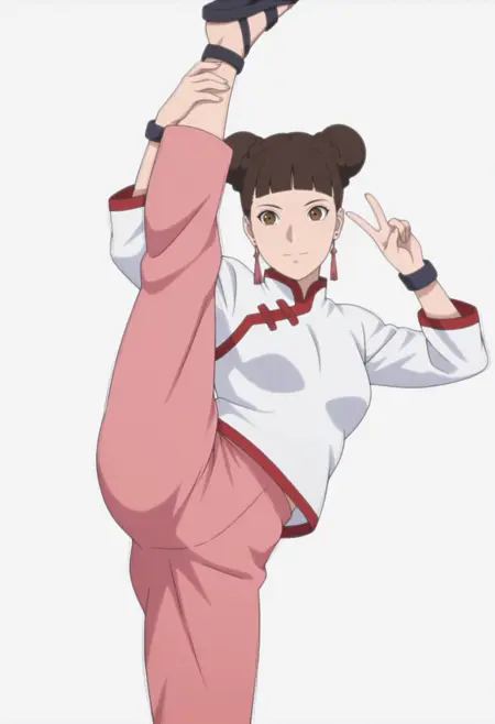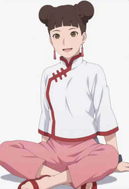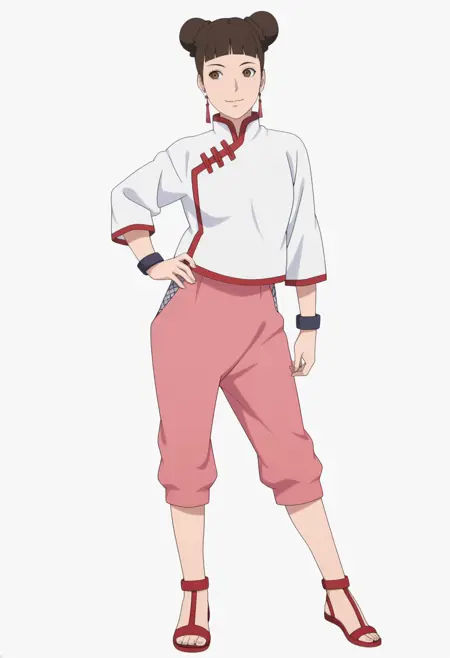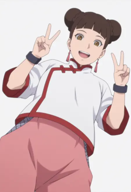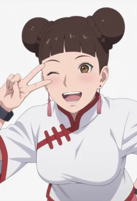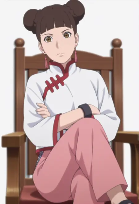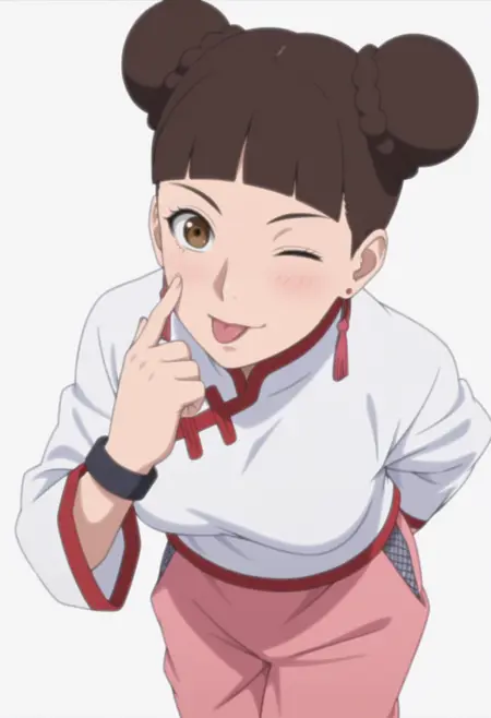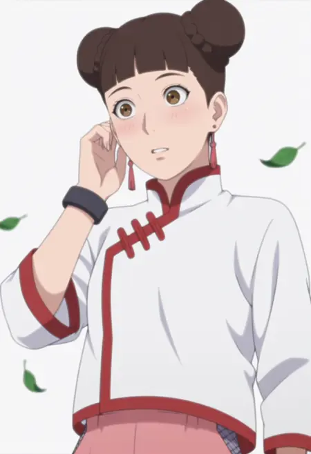 tenten, brown eyes, brown hair, double bun, bun with braided base, blunt bangs,