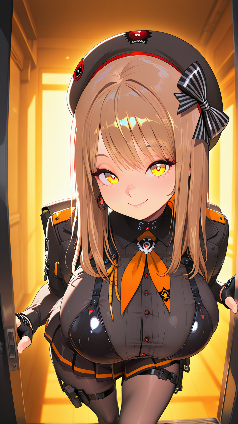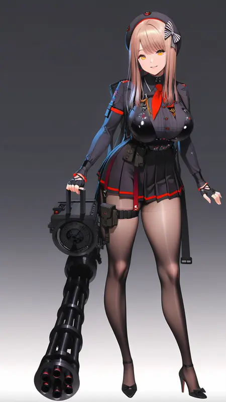 示例提示:1girl, bangs, black beret, brown hair, hair bow, long hair, large breasts, yellow eyes, fingerless gloves, pleated skirt, skirt, black uniform, pantyhose, high heels, thigh strap,