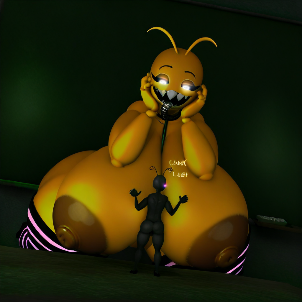 <lora:Toy Chica (Cyanu):1>,toy chica,animatronic, yellow skin, curvy, sharp teeth,Cyanu_Toy_Chica