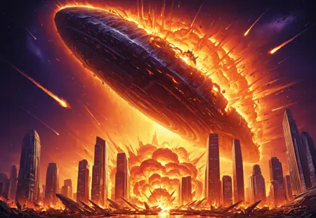 Coldromb2,坠落的空间站,航天器毁灭,科幻城市,未来摩天大楼,火焰冲击,巨大爆炸