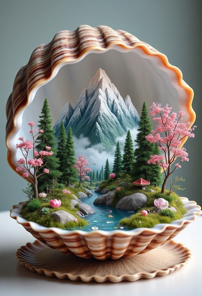 조개 안에 담긴 미니어처 판타지 풍경, 조개 안에 고요한 산경관이 있고, 분홍 꽃이 피고, 안개 낀 봉우리, 작은 시내가 흐르며, 평화롭고 꿈같은 분위기이다.