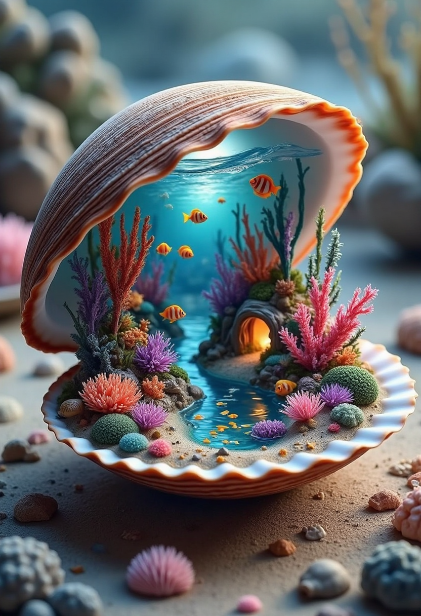 조개 안에 담긴 미니어처 판타지 풍경, 조개 안에 화려한 산호초 세계가 숨어 있고, 물고기들이 헤엄치며, 분홍과 보라 색의 산호, 작은 수중 동굴이 부드럽게 빛나고 있다.