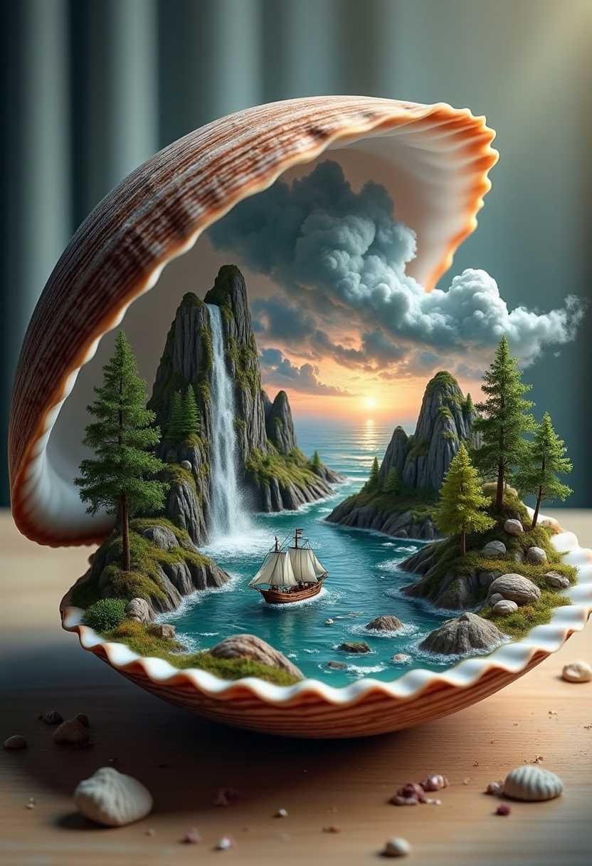 조개 안에 담긴 미니어처 판타지 풍경, 조개 안에 폭풍 치는 바다가 있고, 항해하는 배가 있으며, 파도가 부서지고, 어두운 구름이 끼었지만, 황금빛 햇빛이 틈을 통해 스며든다.