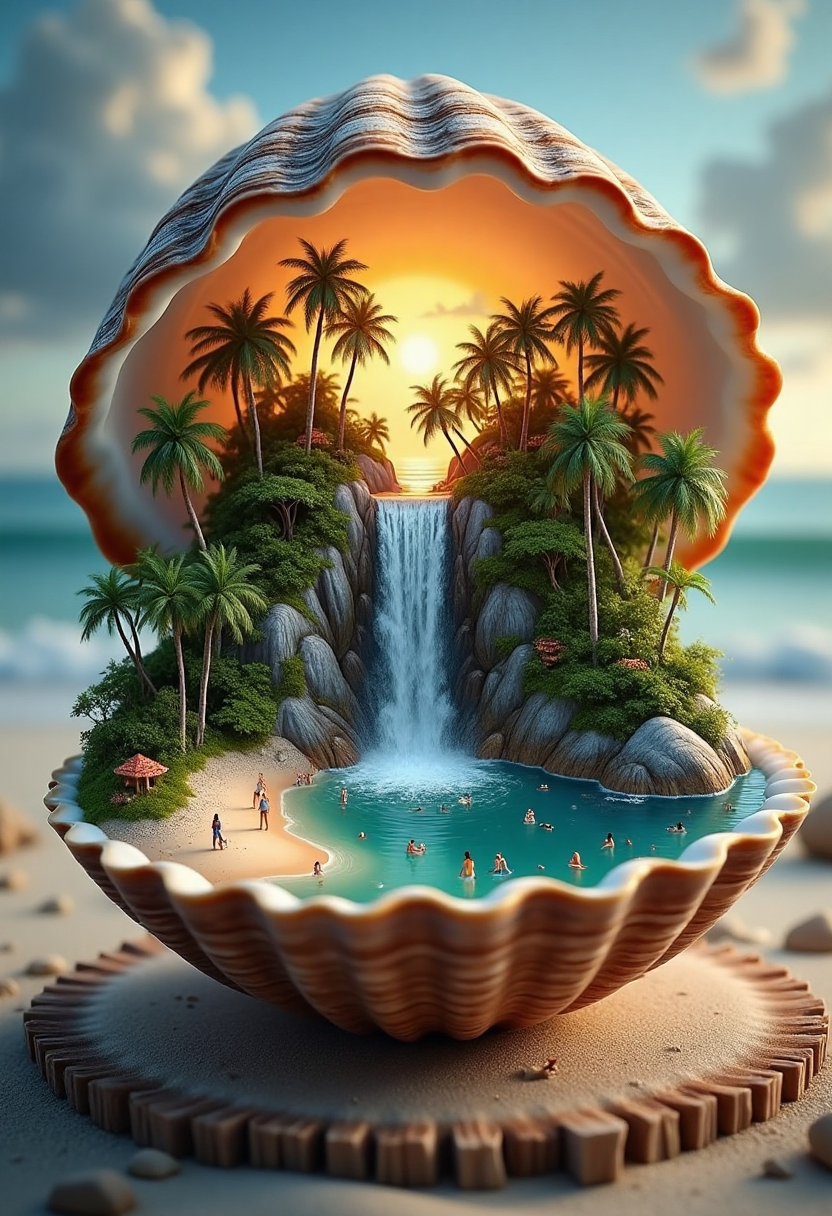 조개 안에 담긴 미니어처 판타지 풍경, 조개 안에 빛나는 폭포가 있고, 주변은 열대 섬, 모래사장, 야자수, 맑은 푸른 물, 작은 사람들이 수영하고 있다.