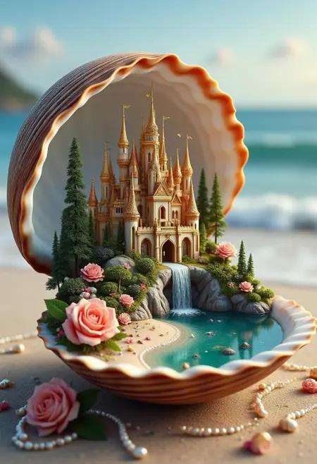조개 안에 담긴 미니어처 판타지 풍경, 조개 안에 바다 옆에 황금 성채가 있고, 해변에는 진주와 장미가 장식되어 있으며, 멀리서 부드러운 파도가 일고 있다.