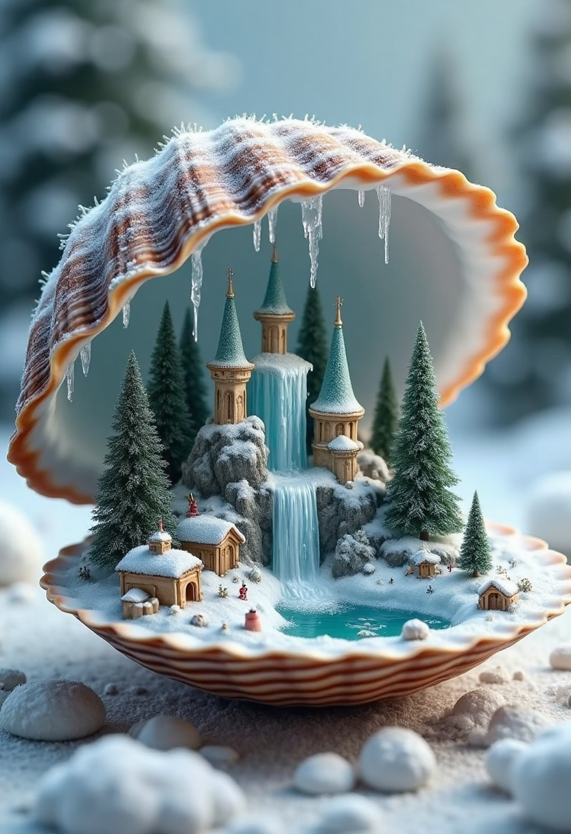 조개 안에 담긴 미니어처 판타지 풍경, 조개 안에 눈 덮인 겨울 동화 세계가 펼쳐지고, 작은 얼음 성, 눈사람, 얼음장식들이 매달려 있으며, 고요하고 서늘한 풍경이다.
