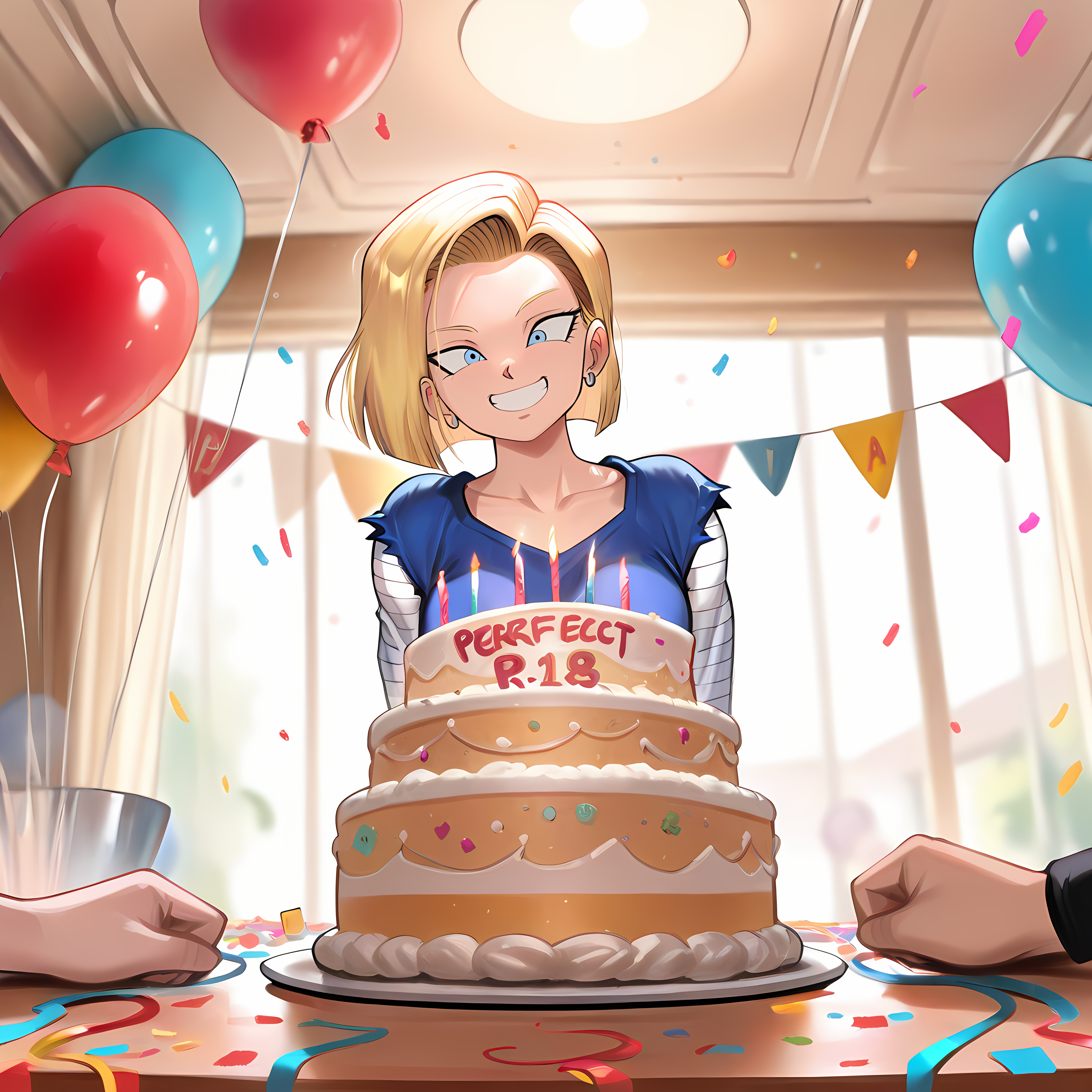 birthday cake, confetti, indoors, food, balloon, string of flags, table, happy birthday, gift box, party popper