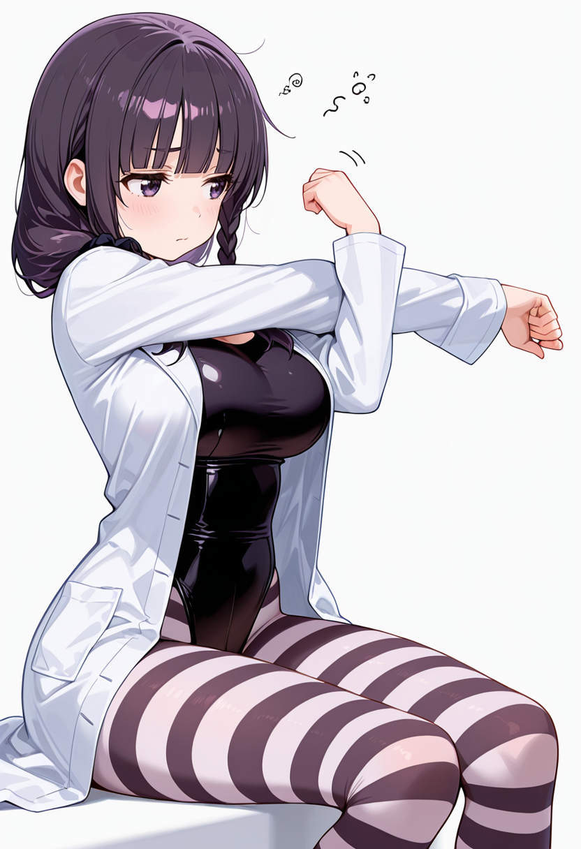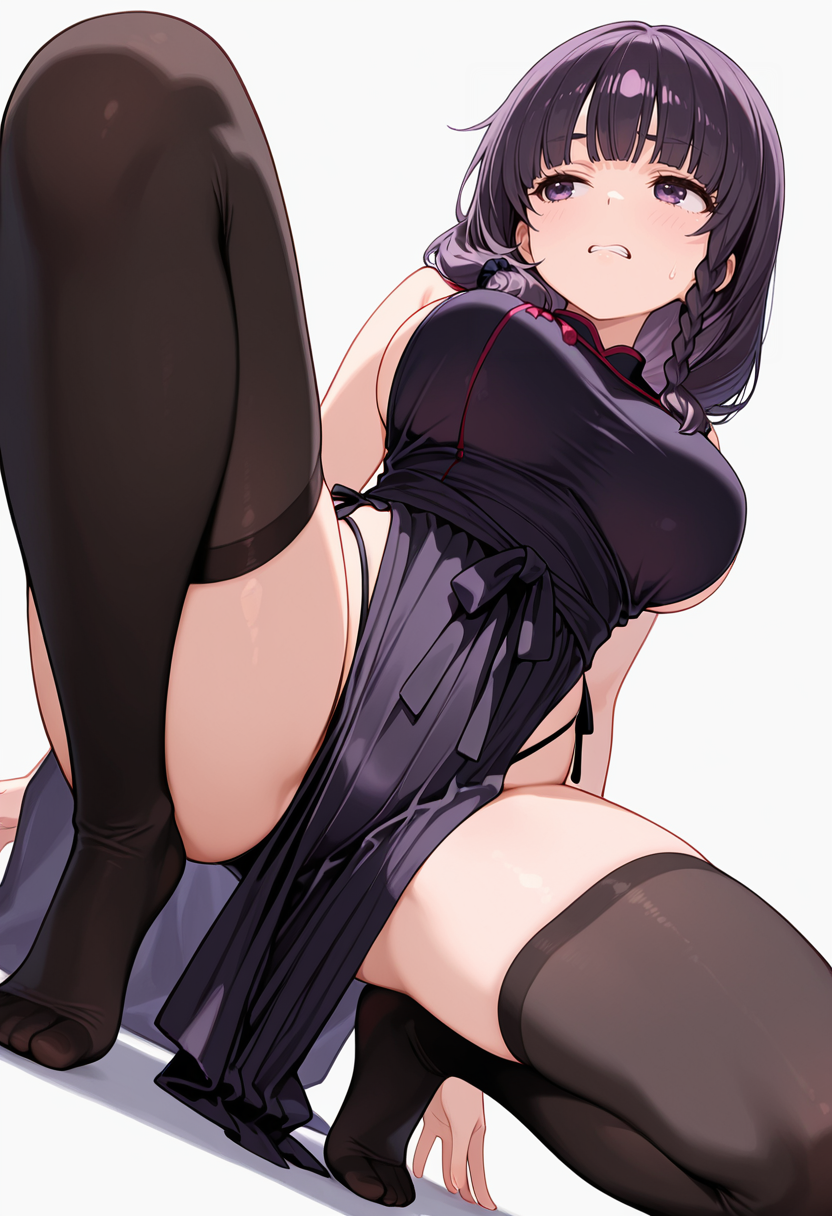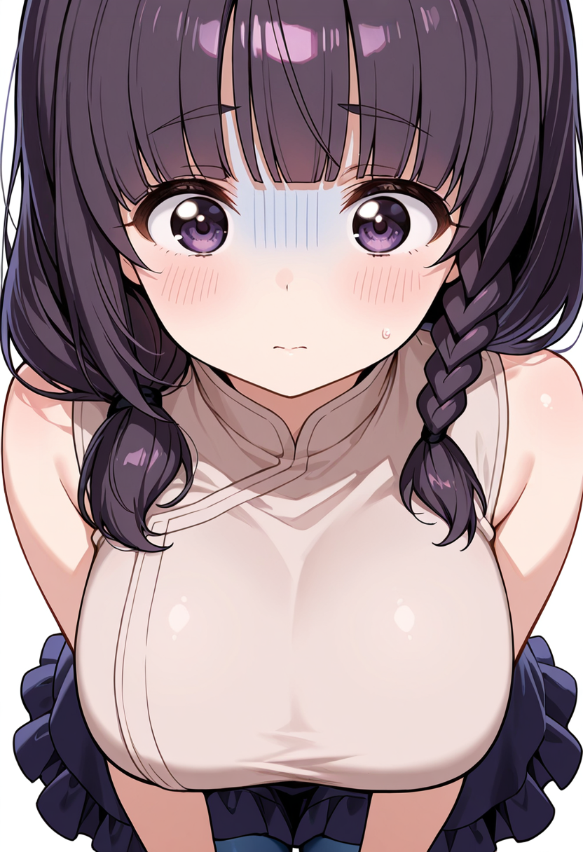 mayu_cnr, 1girl,purple hair, long hair, braid,single braid, blunt bangs, hair over shoulder, purple eyes, large breasts,