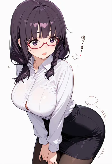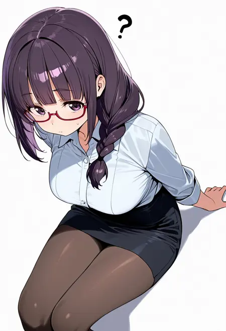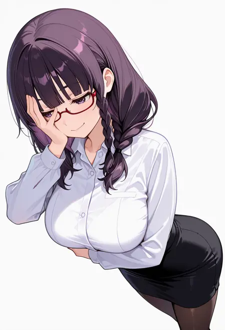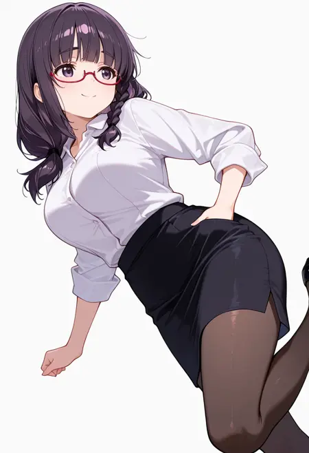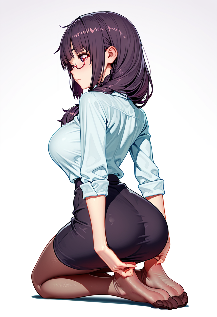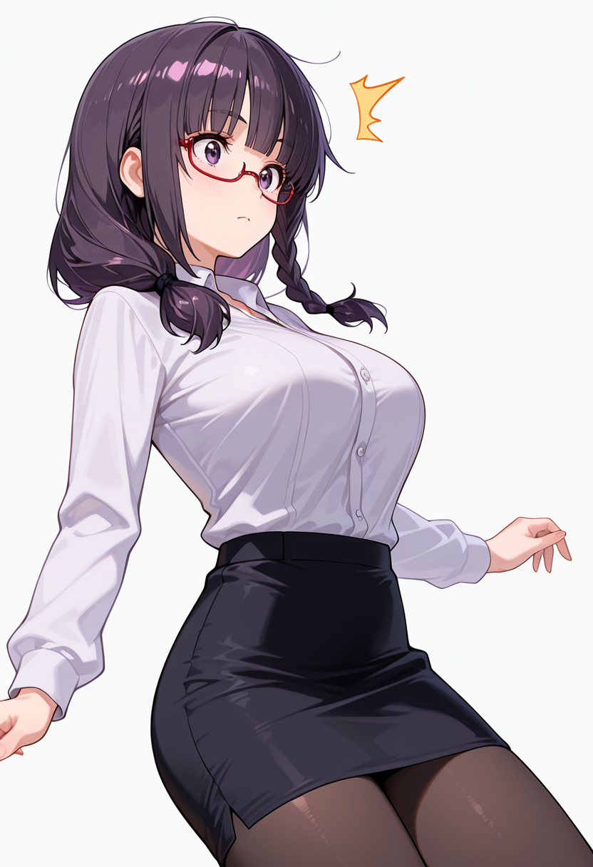 white collared shirt, dress shirt,black pencil skirt, pantyhose,red-framed eyewear, under-rim eyewear, office lady,