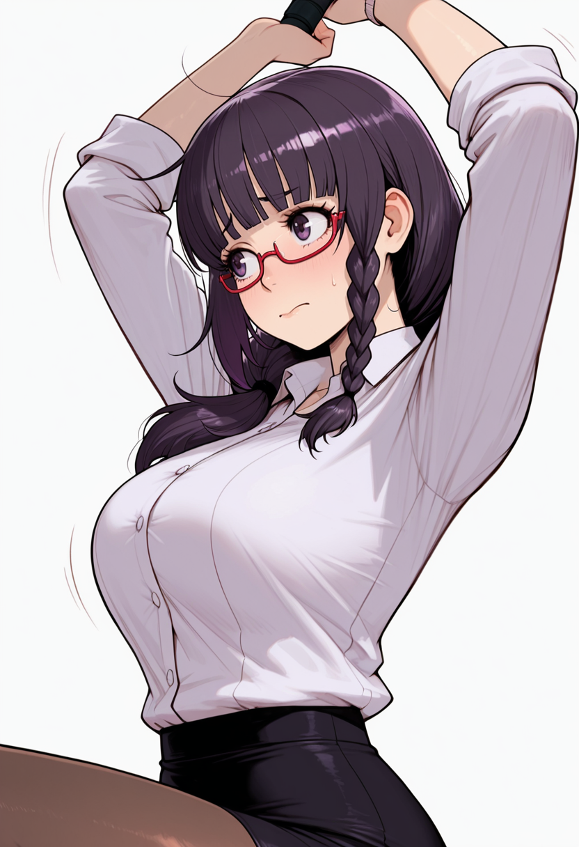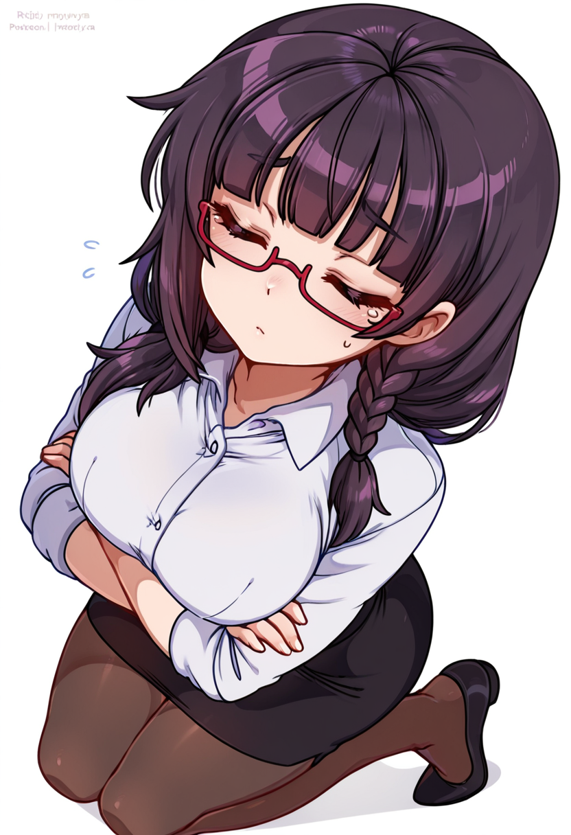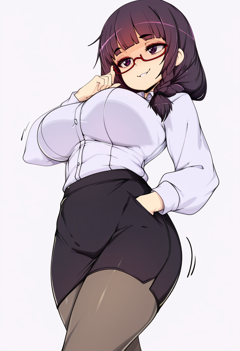 white collared shirt, dress shirt,black pencil skirt, pantyhose,red-framed eyewear, under-rim eyewear, office lady,
